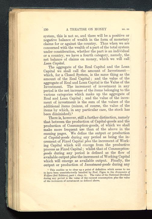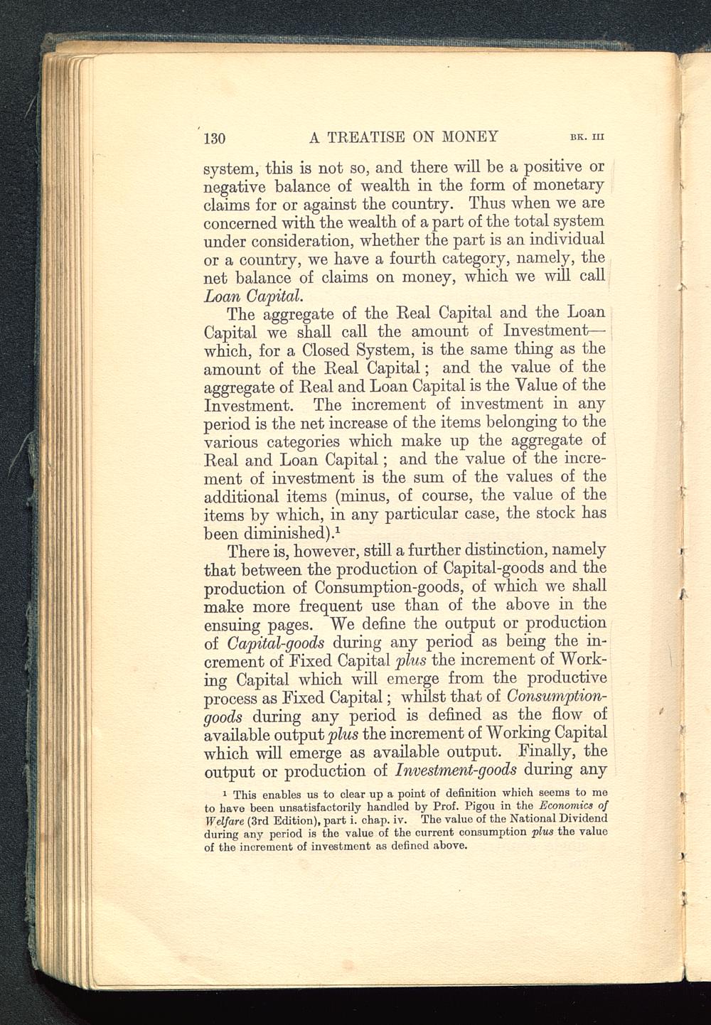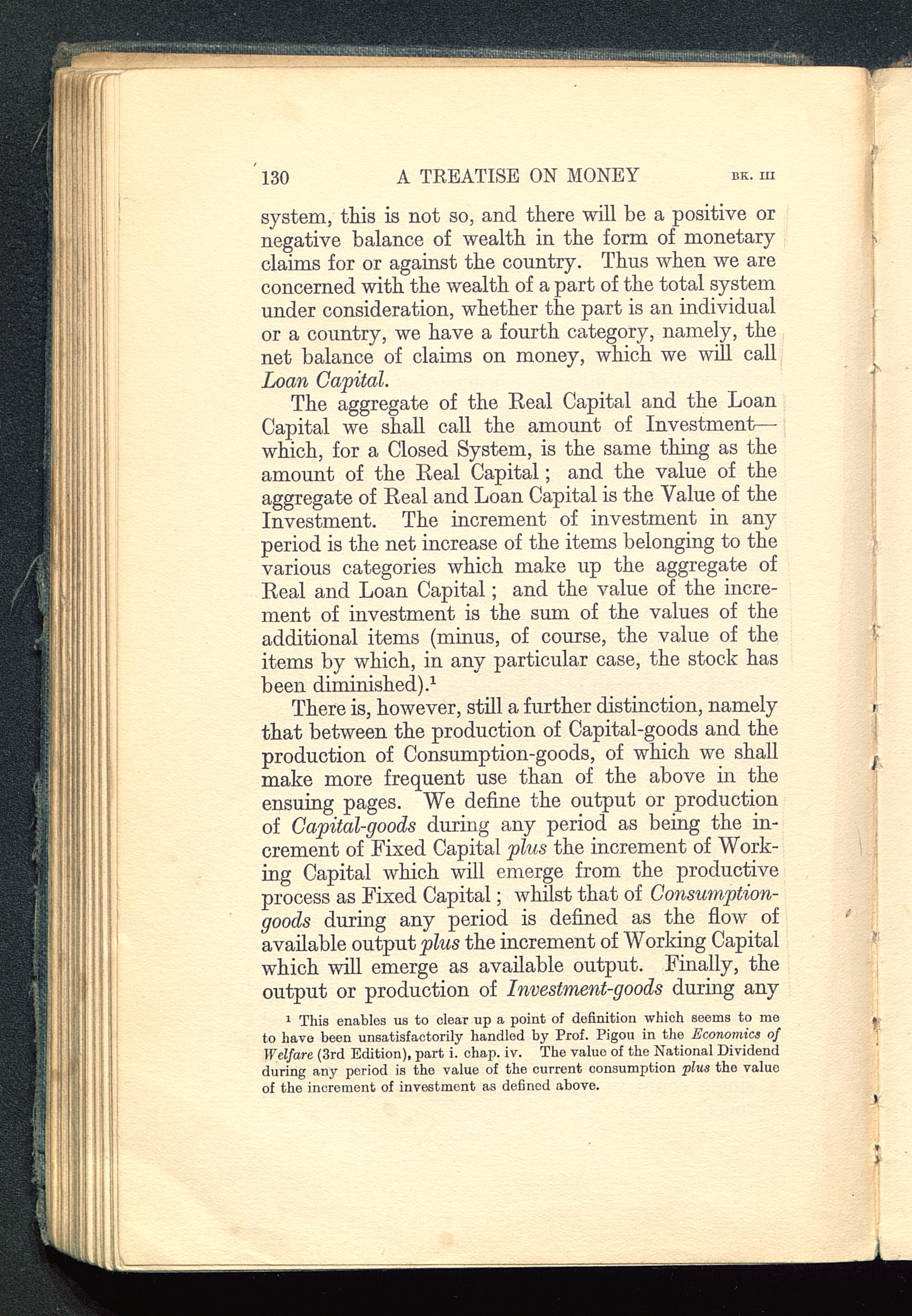 There is, however, still a further distinction, namelythat between the production of Capital-goods and theproduction of Consumption-goods, of which we shallmake more frequent use than of the above in theensuing pages. We define the output or productionof Capital-goods during any period as being the in-crement of Fixed Capital plus the increment of Work-ing Capital which will emerge from the productiveprocess as Fixed Capital; whilst that of Consumption-goods during any period is defined as the flow ofavailable output plus the increment of Working Capital which will emerge as available output. Finally, theoutput or production of Investment-goods during any