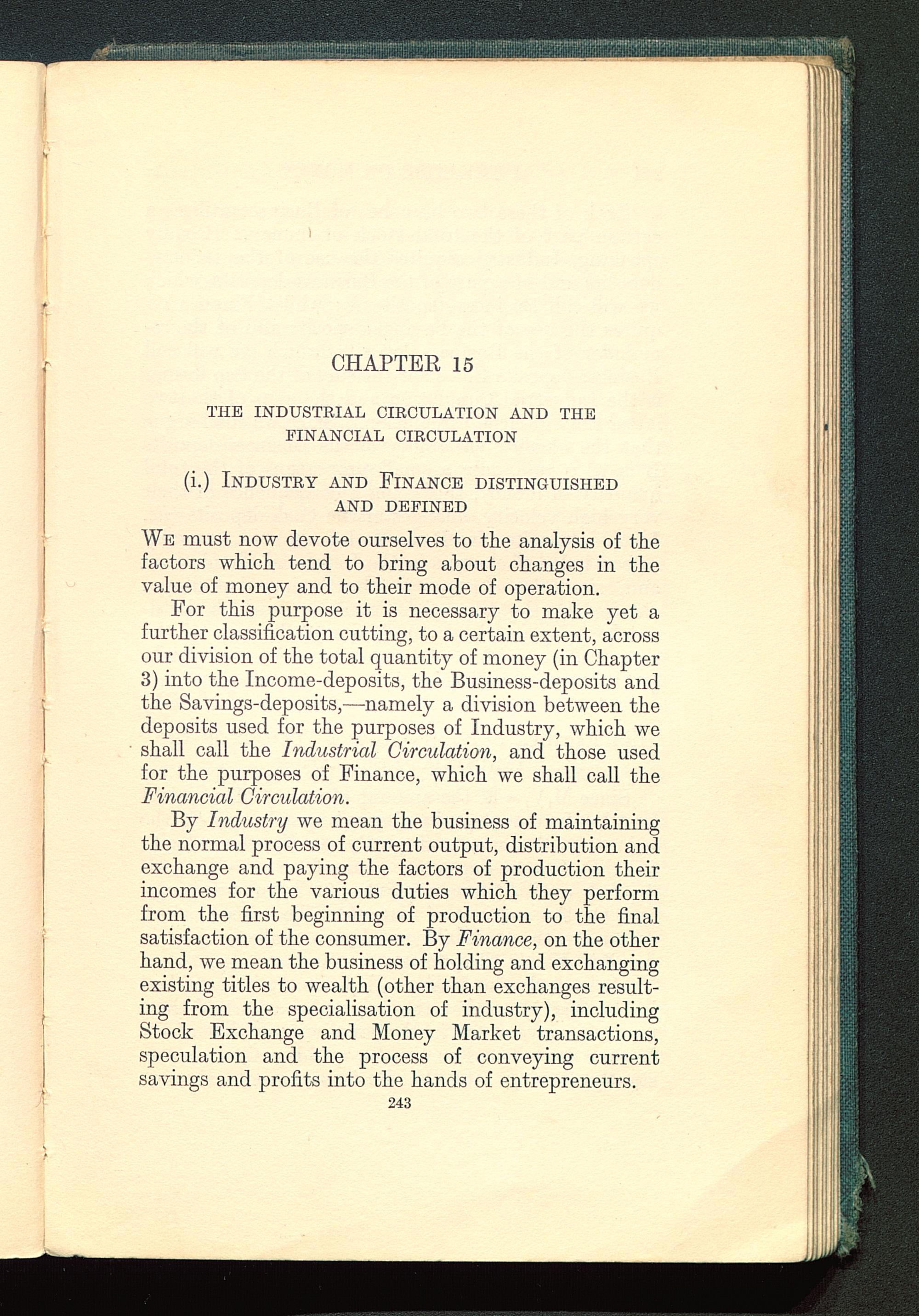 For this purpose it is necessary to make yet afurther classification cutting, to a certain extent, acrossour division of the total quantity of money (in Chapter3) into the Income-deposits, the Business-deposits andthe Savings-deposits,—namely a division between thedeposits used for the purposes of Industry, which weshall call the Industrial Circulation, and those usedfor the purposes of Finance, which we shall call theFinancial Circulation.