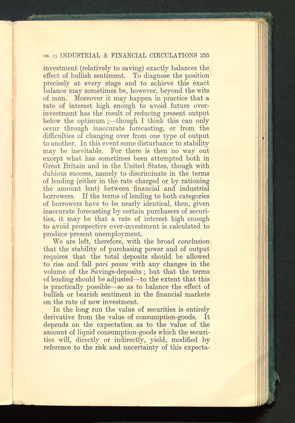 In the long run the value of securities is entirelyderivative from the value of consumption-goods. Itdepends on the expectation as to the value of theamount of liquid consumption-goods which the securi-ties will, directly or indirectly, yield, modified byreference to the risk and uncertainty of this expecta-