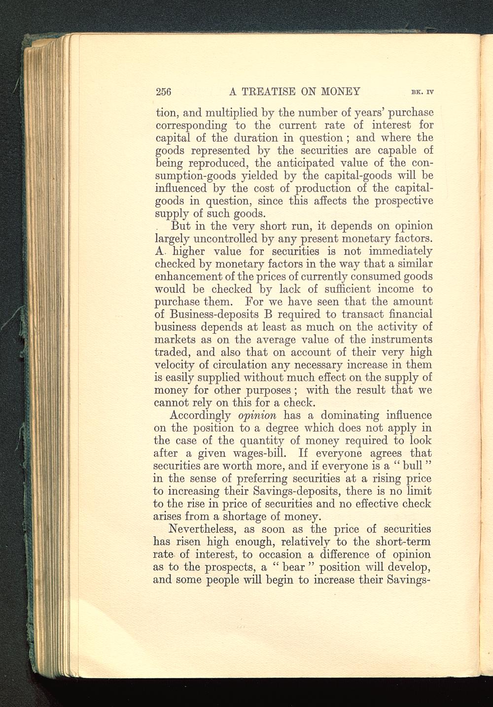 Accordingly opinion has a dominating influenceon tbe position to a degree which does not apply intbe case of tbe quantity of money required to lookafter a given wages-bill. If everyone agrees thatsecurities are worth more, and if everyone is a “ bull ”in tbe sense of preferring securities at a rising priceto increasing their Savings-deposits, there is no limitto tbe rise in price of securities and no effective checkarises from a shortage of money.