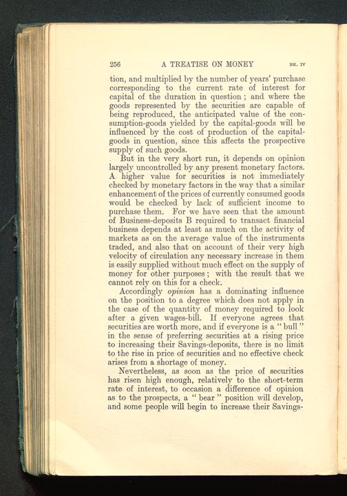 But in tbe very short run, it depends on opinionlargely uncontrolled by any present monetary factors.A. higher value for securities is not immediatelychecked by monetary factors in tbe way that a similarenhancement of tbe prices of currently consumed goodswould be checked by lack of sufficient income topurchase them. For we have seen that tbe amountof Business-deposits B required to transact financialbusiness depends at least as much on tbe activity ofmarkets as on tbe average value of tbe instrumentstraded, and also that on account of their very highvelocity of circulation any necessary increase in themis easily supplied without much effect on tbe supply ofmoney for other purposes ; with tbe result that wecannot rely on this for a check.