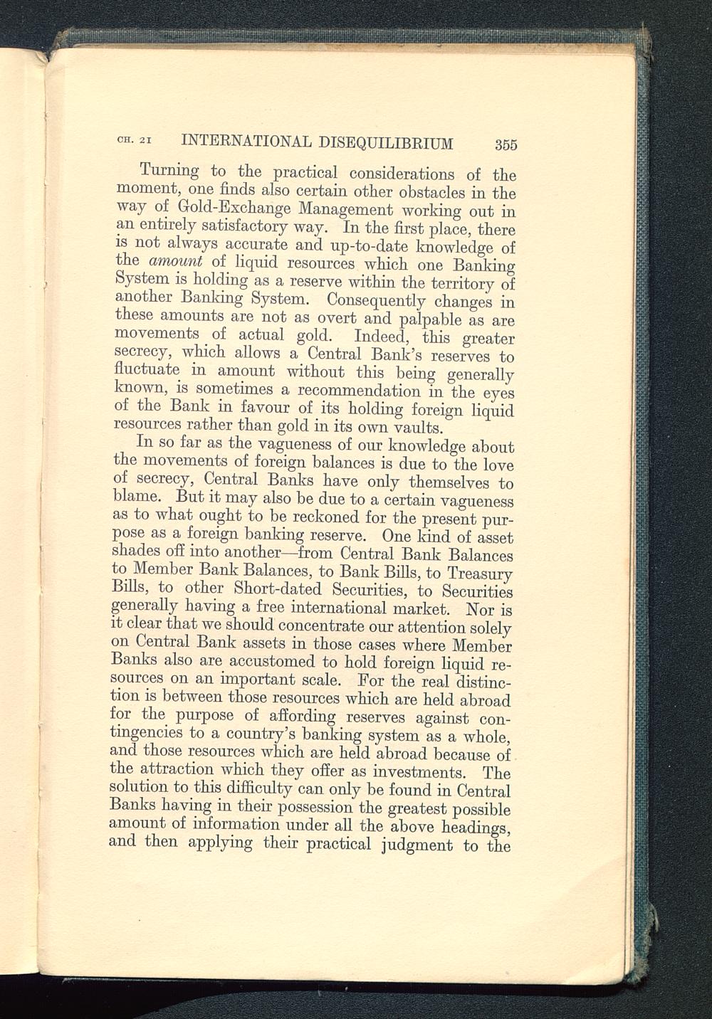Turning to the practical considerations of themoment, one finds also certain other obstacles in theway of Gold-Exchange Management working out inan entirely satisfactory way. In the first place, thereis not always accurate and up-to-date knowledge ofthe amount of liquid resources which one BankingSystem is holding as a reserve within the territory ofanother Banking System. Consequently changes inthese amounts are not as overt and palpable as aremovements of actual gold. Indeed, this greatersecrecy, which allows a Central Bank ’s reserves tofluctuate in amount without this being generallyknown, is sometimes a recommendation in the eyesof the Bank in favour of its holding foreign liquidresources rather than gold in its own vaults.