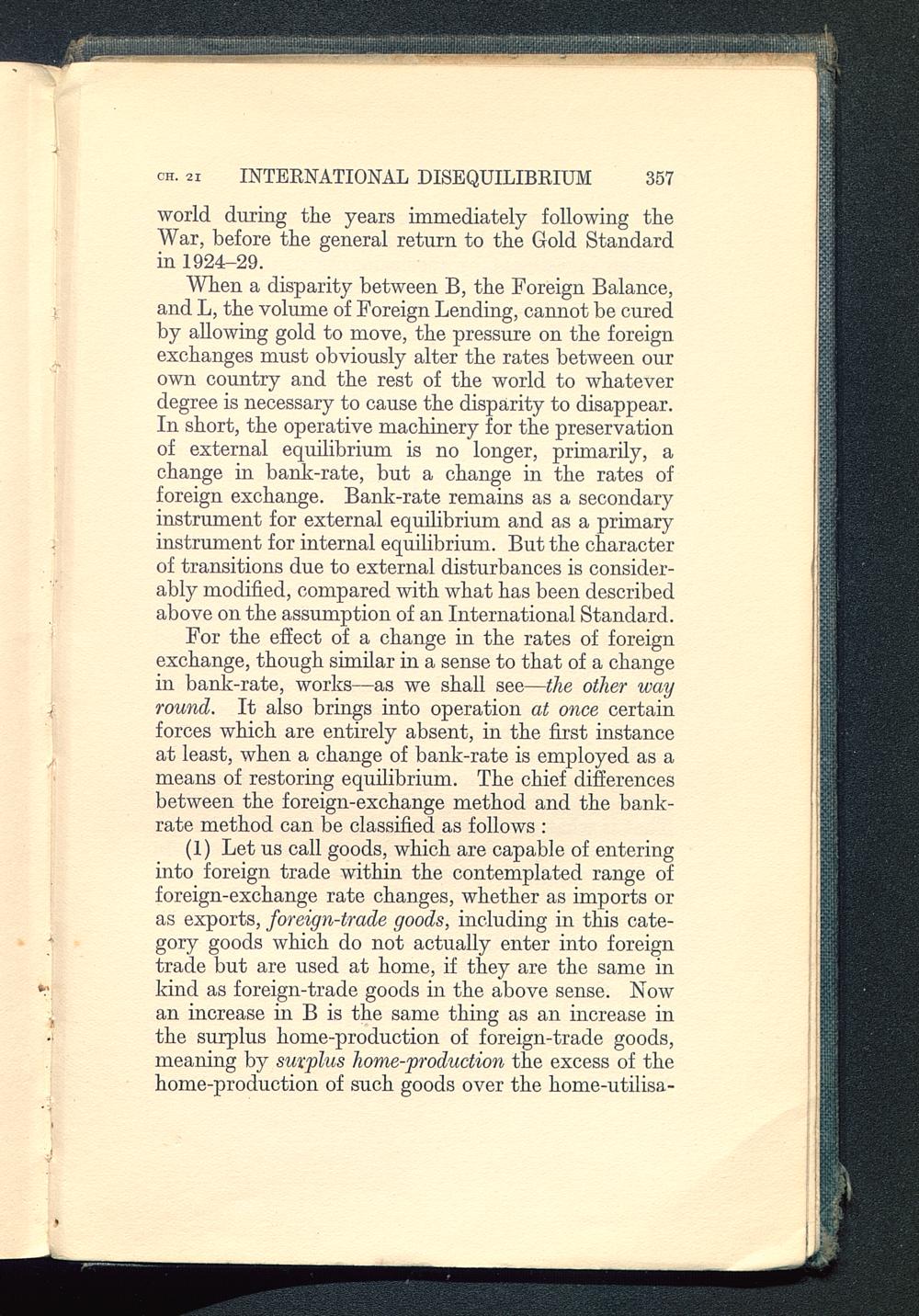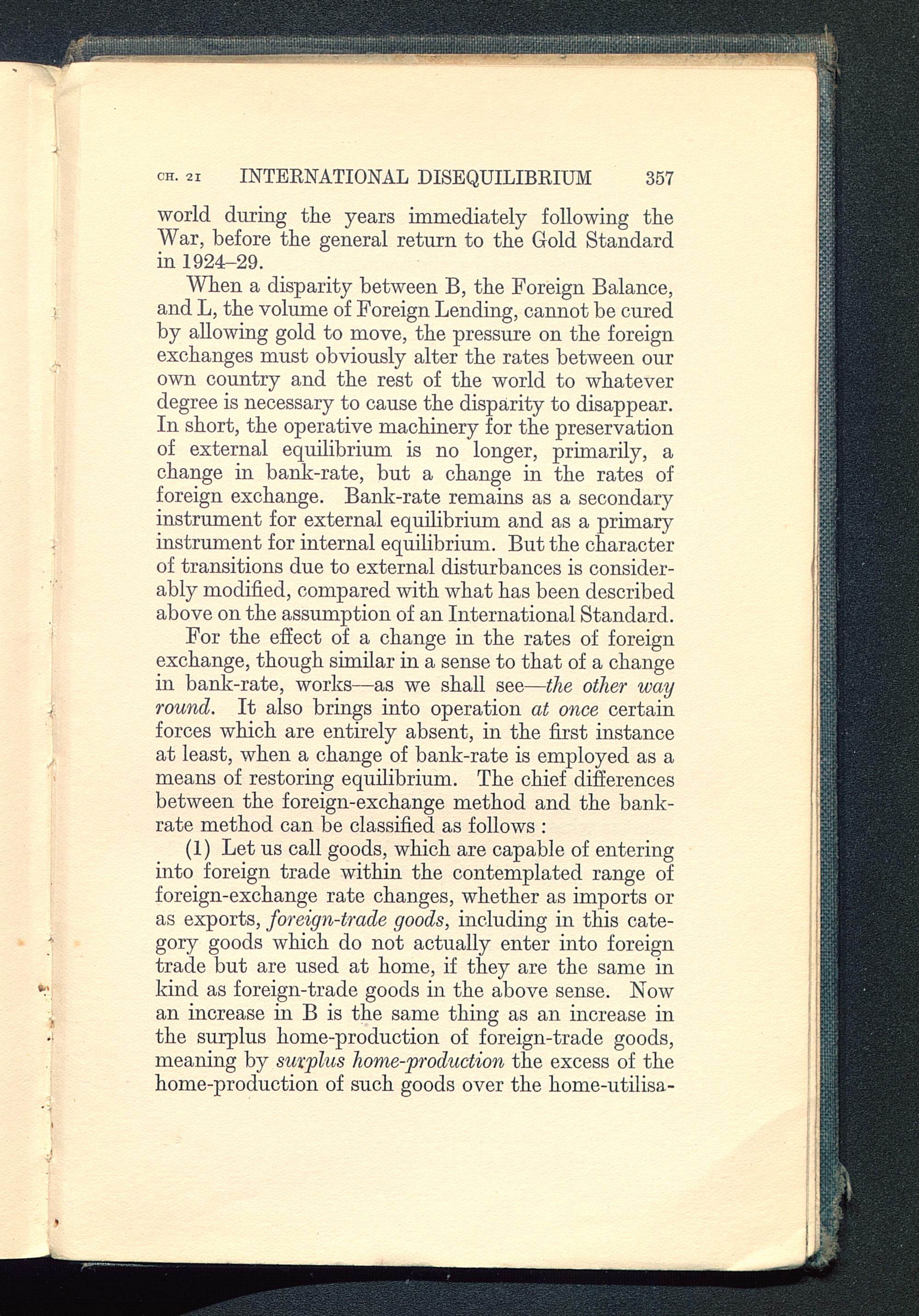 (1) Let us call goods, which are capable of enteringinto foreign trade within the contemplated range offoreign-exchange rate changes, whether as imports oras exports, foreign-trade goods, including in this cate-gory goods which do not actually enter into foreigntrade but are used at home, if they are the same inkind as foreign-trade goods in the above sense. Nowan increase in B is the same thing as an increase inthe surplus home-production of foreign-trade goods,meaning by surplus home-production the excess of thehome-production of such goods over the home-utilisa-