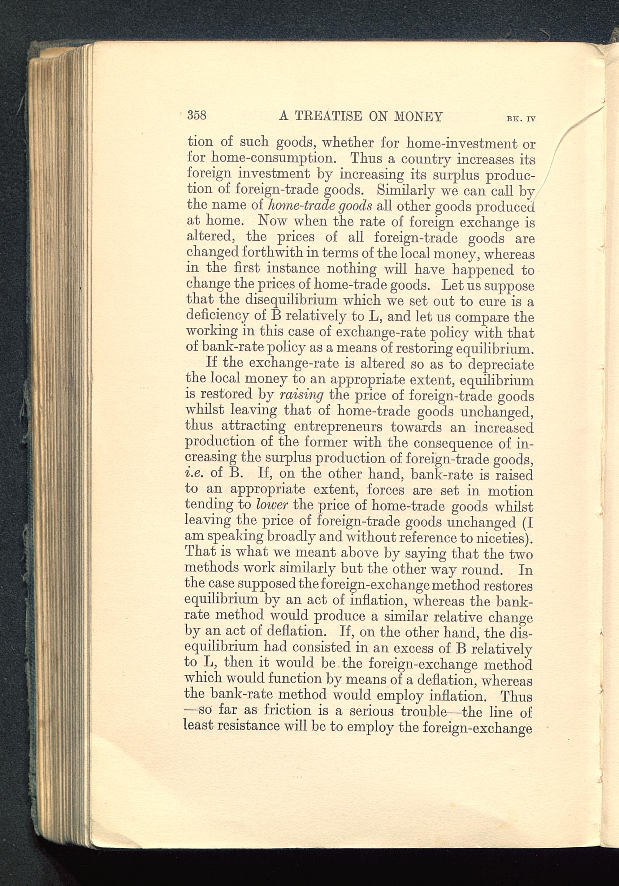 If the exchange-rate is altered so as to depreciatethe local money to an appropriate extent, equilibriumis restored by raising the price of foreign-trade goodswhilst leaving that of home-trade goods unchanged,thus attracting entrepreneurs towards an increasedproduction of the former with the consequence of in-creasing the surplus production of foreign-trade goods,i.e. of B. If, on the other hand, bank-rate is raisedto an appropriate extent, forces are set in motiontending to lower the price of home-trade goods whilstleaving the price of foreign-trade goods unchanged (Iam speaking broadly and without reference to niceties).That is what we meant above by saying that the twomethods work similarly but the other way round. Inthe case supposed the foreign-exchange method restoresequilibrium by an act of inflation, whereas the bank-rate method would produce a similar relative changeby an act of deflation. If, on the other hand, the dis-equilibrium had consisted in an excess of B relativelyto L, then it would be the foreign-exchange methodwhich would function by means of a deflation, whereasthe bank-rate method would employ inflation. Thus—so far as friction is a serious trouble—the line ofleast resistance will be to employ the foreign-exchange