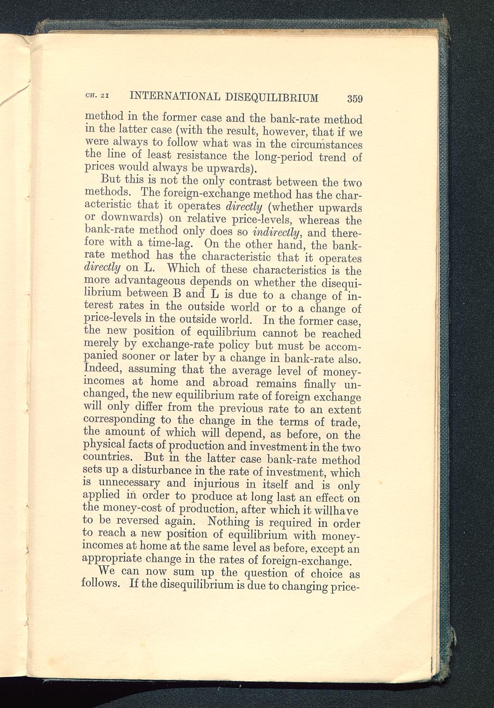 But this is not the only contrast between the twomethods. The foreign-exchange method has the char-acteristic that it operates directly (whether upwardsor downwards) on relative price-levels, whereas thebank-rate method only does so indirectly , and there-fore with a time-lag. On the other hand, the bank-rate method has the characteristic that it operatesdirectly on L. Which of these characteristics is themore advantageous depends on whether the disequi-librium between B and L is due to a change of in-terest rates in the outside world or to a change ofprice-levels in the outside world. In the former case,the new position of equilibrium cannot be reachedmerely by exchange-rate policy but must be accom-panied sooner or later by a change in bank-rate also.Indeed, assuming that the average level of money-incomes at home and abroad remains finally un-changed, the new equilibrium rate of foreign exchangewill only differ from the previous rate to an extentcorresponding to the change in the terms of trade,the amount of which will depend, as before, on thephysical facts of production and investment in the twocountries. But in the latter case bank-rate methodsets up a disturbance in the rate of investment, whichis unnecessary and injurious in itself and is onlyapplied in order to produce at long last an effect onthe money-cost of production, after which it willhaveto be reversed again. Nothing is required in orderto reach a new position of equilibrium with money-incomes at home at the same level as before, except anappropriate change in the rates of foreign-exchange.