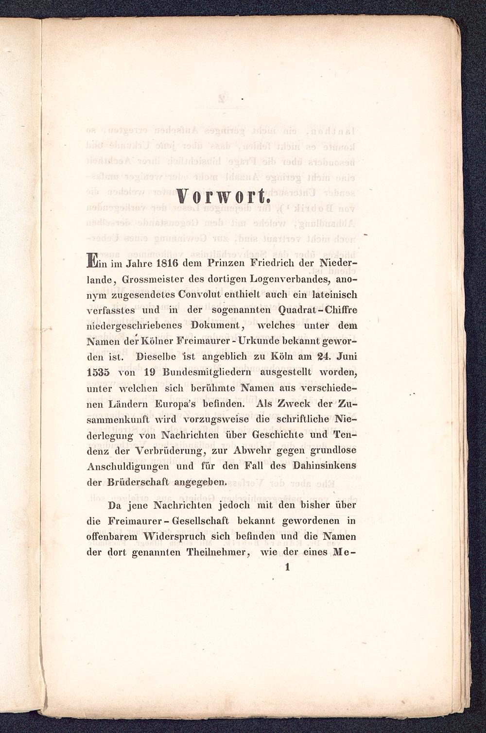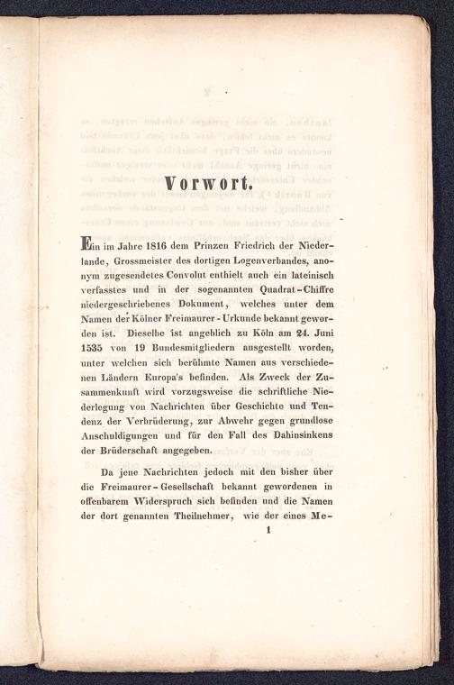 Ein im Jahre 1816 dem Prinzen Friedrich der Nieder-lande , Grossmeistcr des dortigen Logenverbandes, ano-nym zugesendetes Convolut enthielt auch ein lateinischverfasstes und in der sogenannten Quadrat-Chiffreniedergeschriebenes Dokument, welches unter demNamen der Kölner Freimaurer - Urkunde bekannt gewor-den ist. Dieselbe Ist angeblich zu Köln am 24. Juni1535 von 19 Bundesmitgliedcrn ausgestellt worden,unter welchen sich berühmte Namen aus verschiede-nen Ländern Europa's befinden. Als Zweck der Zu-sammenkunft wird vorzugsweise die schriftliche Nie-derleo'un"' von Nachrichten über Geschichte und Ten-