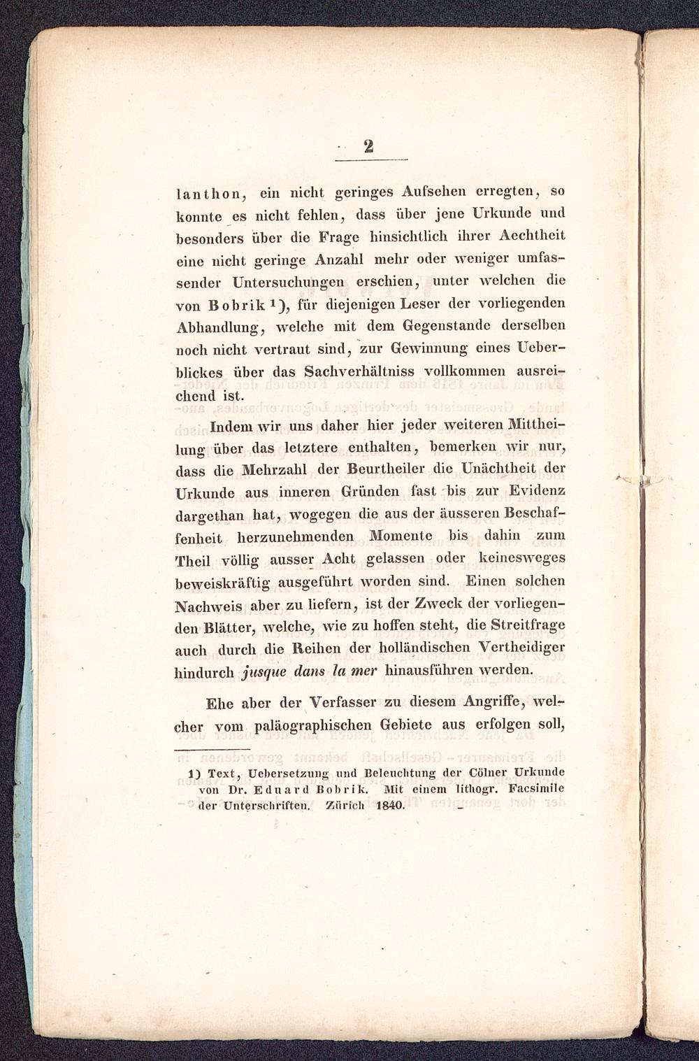 lauthon, ein nicht geringes Aufsehen erregten, sokonnte es nicht fehlen, dass über jene Urkunde undbesonders über die Frage hinsichtlich ihrer Aechthciteine nicht geringe Anzahl mehr oder weniger umfas-sender Untersuchungen erschien, unter welchen dievon Bobrik 1 ), für diejenigen Leser der vorliegendenAbhandlung, welche mit dem Gegenstande derselbennoch nicht vertraut sind, zur Gewinnung eines Ucber-blickes über das Sachverhältniss vollkommen ausrei-chend ist.