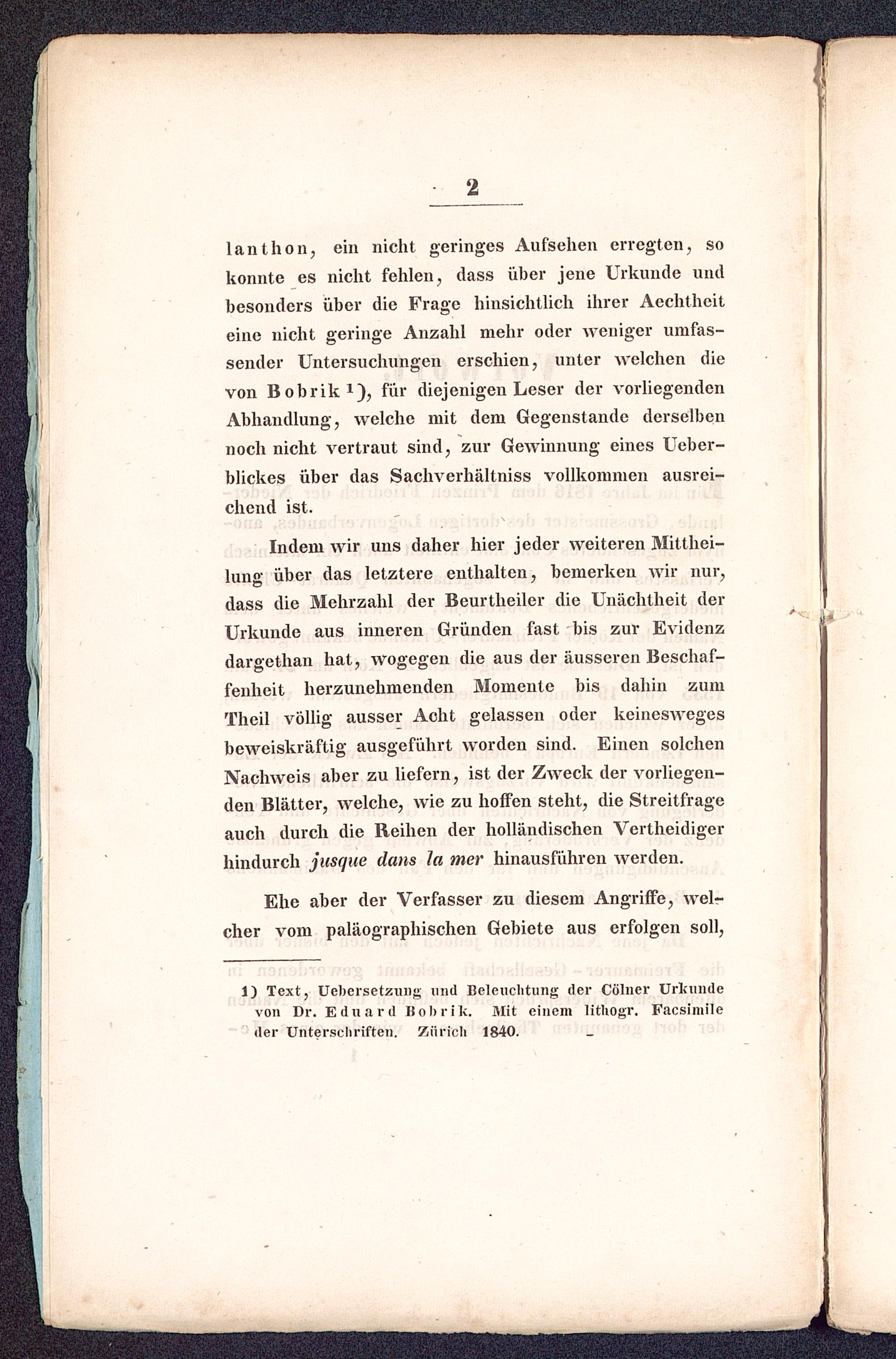 Indem wir uns daher hier jeder weiteren Mitthei-lung über das letztere enthalten, bemerken wir nur,dass die Mehrzahl der Beurtheiler die Unächtheit derUrkunde aus inneren Gründen fast bis zur Evidenzdargethan hat, wogegen die aus der äusseren Beschaf-fenheit herzunehmenden Momente bis dahin zumTheil völlig ausser Acht gelassen oder keineswegesbeweiskräftig ausgeführt worden sind. Einen solchenNachweis aber zu liefern, ist der Zweck der vorliegen-den Blätter, welche, wie zu hoffen steht, die Streitfrageauch durch die Reihen der holländischen Vertheidigerhindurch jusque dans Ja mer hinausführen werden.