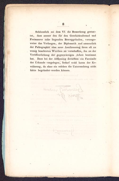 Schliesslich sei dem Vf. die Bemerkung gestat-tet, dass ausser den für den Geschichtsfreund undFreimaurer nahe liegenden Beweggründen, vorzugs-weise das Verlangen, der Diplomatik und namentlichder Paläographie eine neue Anerkennung ihres oft zuwenig beachteten Wcrthes zu verschaffen, ihn zu derVeröffentlichung der gegenwärtigen Arbeit bestimmthat. Dass bei der Abfassung derselben ein Facsimileder Urkunde vorgelegen, bedarf wohl kaum der Er-wähnung, da ohne ein solches die Untersuchung nichthätte begründet- werden können.
