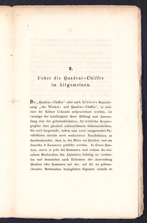 Die „ Quadrat - Chiffre" oder nach Klüher's Bezeich-nung „die Winkel- und Quadrat-Chiffre", in wel-cher die Kölner Urkunde aufgezeichnet worden, istvermöge der Leichtigkeit ihrer Bildung und Anwen-dung eine der gebräuchlichsten, für wirkliche Krypto-graphie aber gänzlich unbrauchbaren Geheimschriften.Sie wird dargestellt, indem man zwei waagerechte Pa-rallellinien mittels zwei senkrechter Parallellinien sodurchschneidet, dass in der Mitte ein Quadrat und umdasselbe 8 Kammern gebildet werden. In dieses Qua-drat, sowie in jede der Kammern sind sodann die ein-zelnen Buchslaben des Alphabets beliebig zu verthei-lcn und demnächst nach Erfordern der AnwendungQuadrat oder Kammern mit der, auf die zu gebrau-chenden Buchstaben bezüglichen Signatur einzeln zu