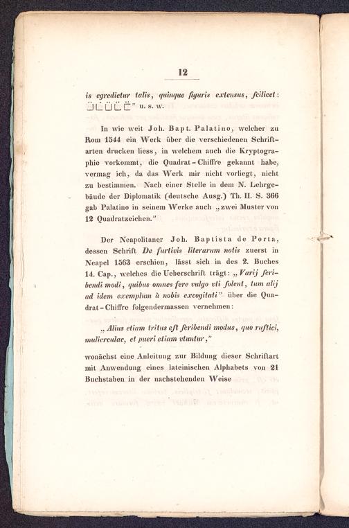 In wie weit Joh. Bapt. Palatino, welcher zuRom 1544 ein Werk über die verschiedenen Schrift-arten drucken Hess, in welchem auch die Kryptogra-phie vorkommt, die Quadrat-Chiffre gekannt habe,vermag ich, da das Werk mir nicht vorliegt, nichtzu bestimmen. Nach, einer Stelle in dem N. Lehrge-bäude der Diplomatie (deutsche Ausg.) Th. II. S. 366gab Palatino in seinem Werke auch „ zwei Muster von12 Quadratzeichen."
