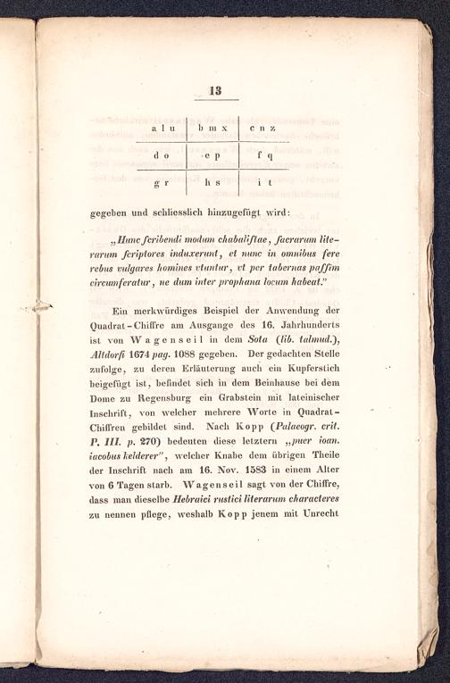 Ein merkwürdiges Beispiel der Anwendung derQuadrat - Chiffre am Ausgange des 16. Jahrhundertsist von W a g c n s e i 1 in dem Sota (Hb. tulmud.'),Altdorfi 1674 pay. 1088 gegeben. Der gedachten Stellezufolge, zu deren Erläuterung auch ein Kupferstichbeigefügt ist, befindet sich in dem Bcinhause bei demDome zu Regensburg " ein Grabstein mit lateinischerInschrift, von welcher mehrere Worte in Quadrat-Chiffren gebildet sind. Nach Kopp (Palaeogr. crit.P. III. p. 270) bedeuten diese letztern „puer hau.ietcobus leiderer", welcher Knabe dem übrigen Theileder Inschrift nach am 16. Nov. 1583 in einem Altervon 6 Tagen starb. Wagenseil sagt von der Chiffre,dass man dieselbe Hebraici rustici Uterarum c/iaractereszu nennen pflege, weshalb Kopp jenem mit Unrecht