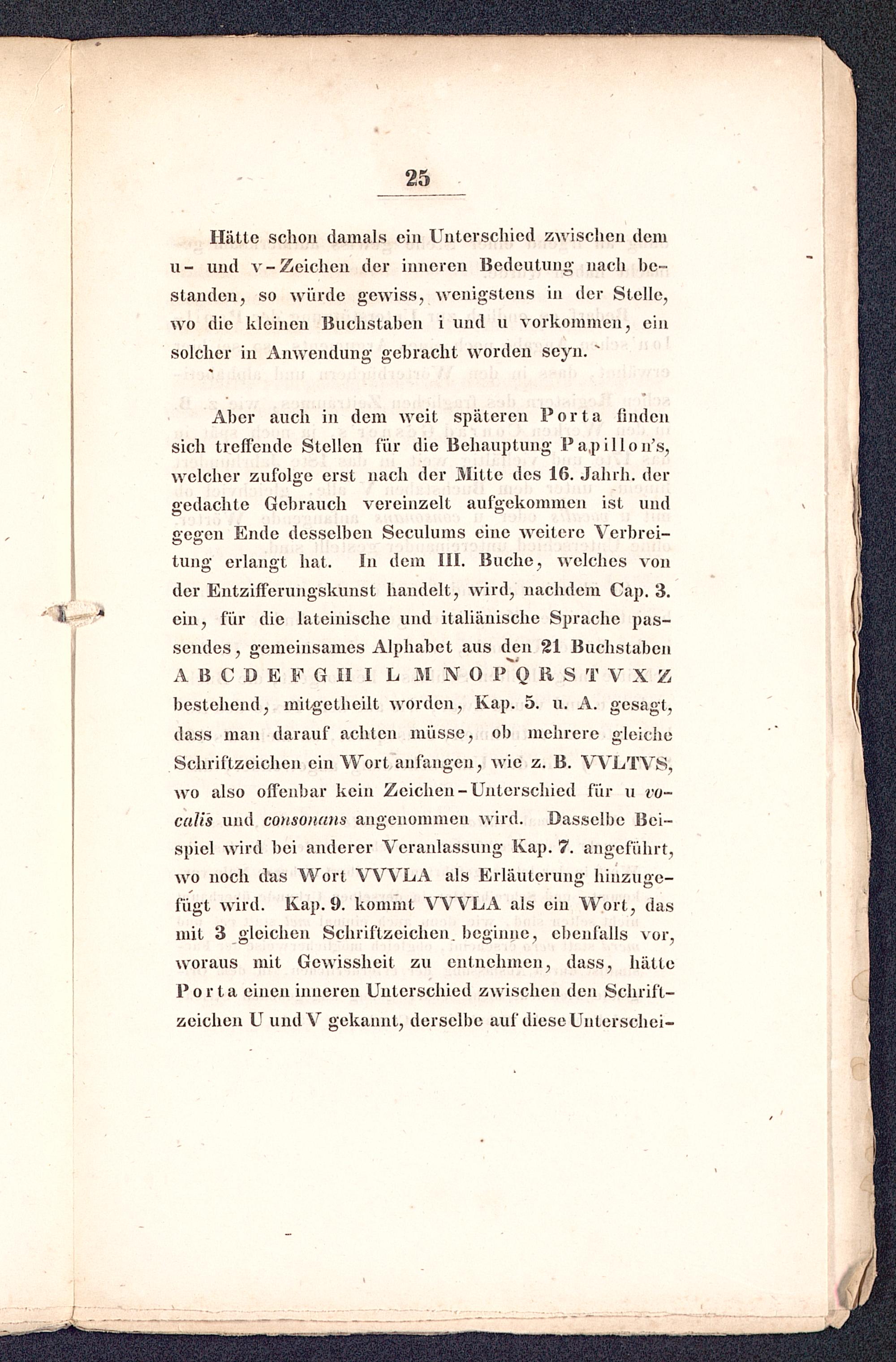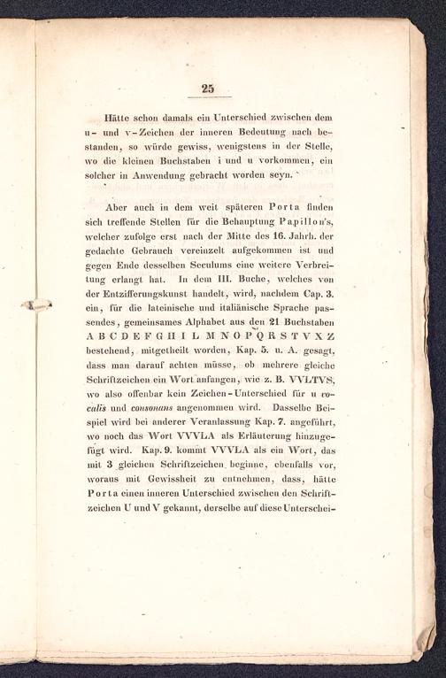 tung erlangt hat. In dem III. Buche, welches vonder Entzifferungskunst handelt, wird, nachdem Cap. 3.ein, für die lateinische und italiänische Sprache pas-sendes, gemeinsames Alphabet aus den 21 BuchstabenABCDEFGHI L HNO P Q R S T VX Zbestehend, mitgethcilt worden, Kap. 5. u. A. gesagt,dass man darauf achten müsse, ob mehrere gleicheSchriftzeichen ein Wort anfangen, wie z. B. VVLTVS,wo also offenbar kein Zeichen-Unterschied für u vo-caU's und consoiutns angenommen wird. Dasselbe Bei-spiel wird bei anderer Veranlassung Kap. 7. angeführt,wo noch das Wort VWLA als Erläuterung hinzuge-fügt wird. Kap. 9. kommt VWLA als ein Wort, dasmit 3 gleichen Schriftzeichen, beginne, ebenfalls vor,woraus mit Gewissheit zu entnehmen, dass, hätteP o r t a einen inneren Unterschied zwischen den Schrift -zeichen U undV gekannt, derselbe auf diese Unterschei-