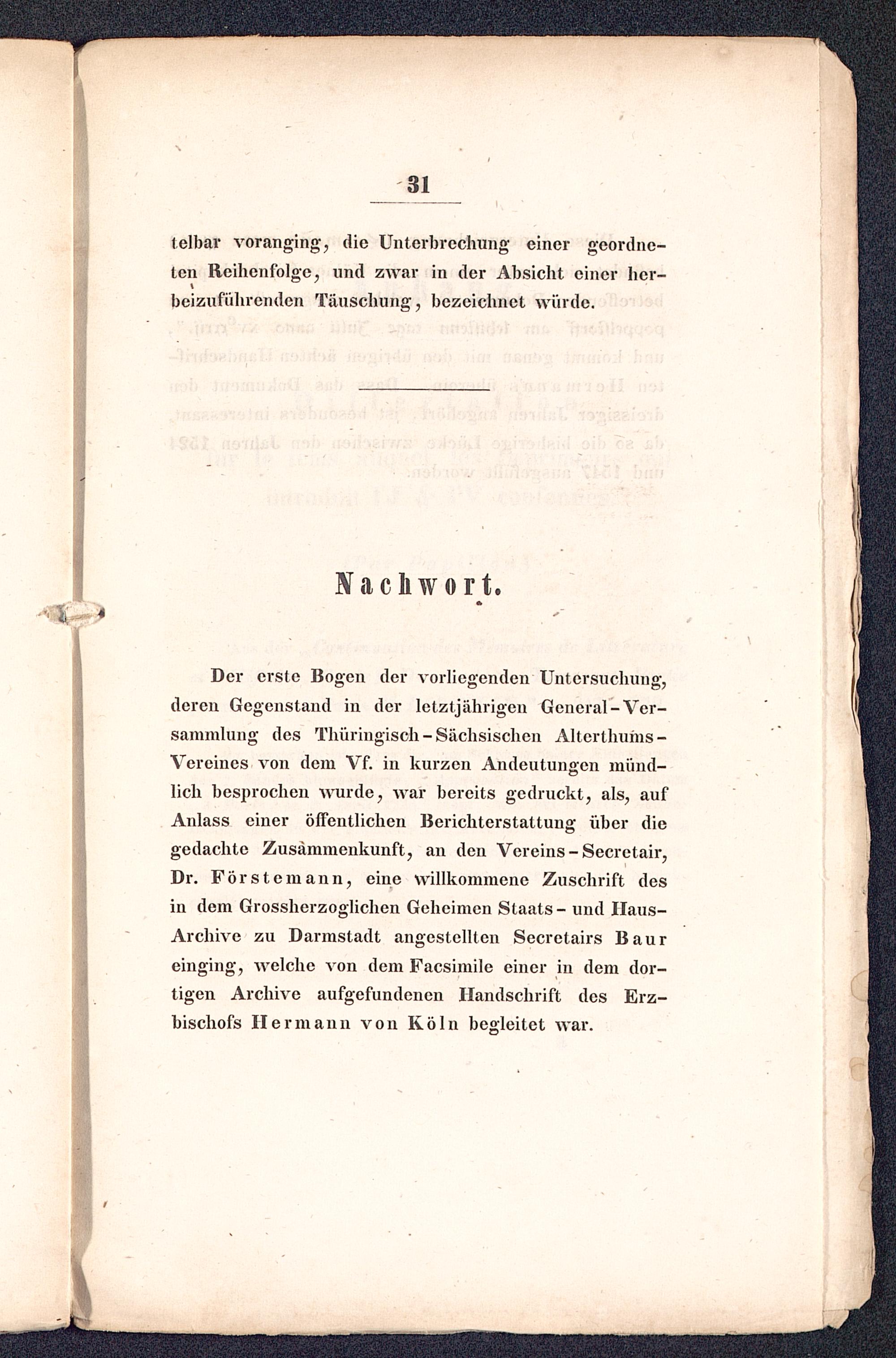 Vereines von dem Vf. in kurzen Andeutungen münd-lich besprochen wurde, war bereits gedruckt, als, aufAnlass einer öffentlichen Berichterstattung über diegedachte Zusammenkunft, an den Vereins-Secretair,Dr. Förstemann, eine willkommene Zuschrift desin dem Grossherzoglichen Geheimen Staats - und Haus-Archive zu Darmstadt angestellten Secretairs Baureinging, welche von dem Facsimile einer in dem dor-tigen Archive aufgefundenen Handschrift des Erz-bischofs Hermann von Köln begleitet war.