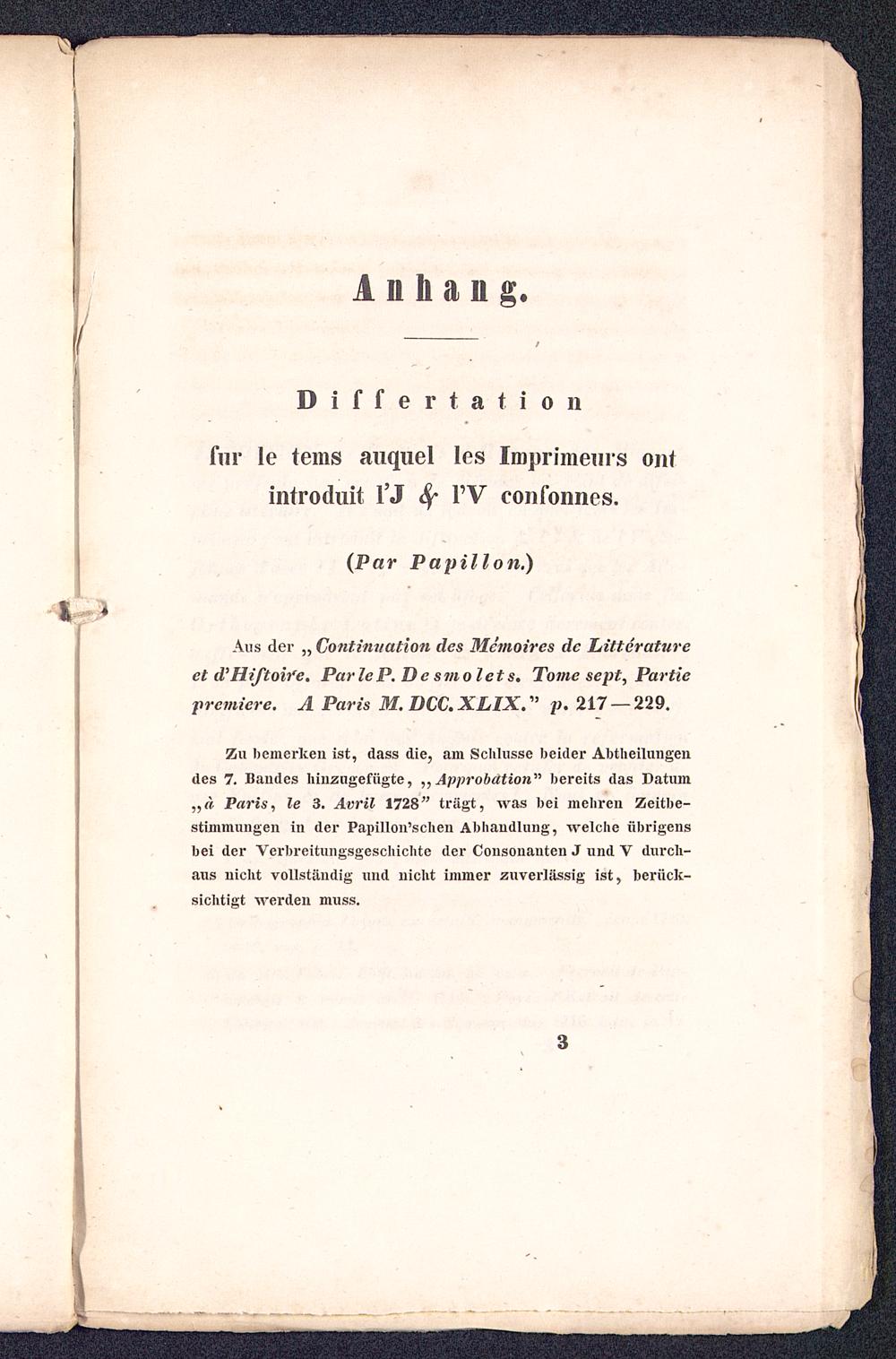 Paris , le 3. Avril 1728" trägt, was bei mehren Zeitbe-stimmungen in der Papillon'schen Abhandlung, welche übrigensbei der Verbreitungsgeschichte der Consonanten J und V durch-aus nicht vollständig und nicht immer zuverlässig ist, berück-sichtigt werden muss.