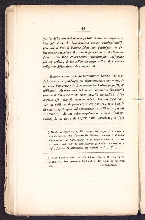 1) M. de la Monnnye />. 395. de fes Notes Ji/r le I. Volumedes Jugernens des Scauans de Bail/et , attribuä ä ZetznerImprimeur de Strafbourg la loüange d'avoir le premierpralique vers 1C09. ce que Ramus 6c Joubcrt avoient pro-pofe, feavoir la diftinetion des confonnes J. & V. &c.