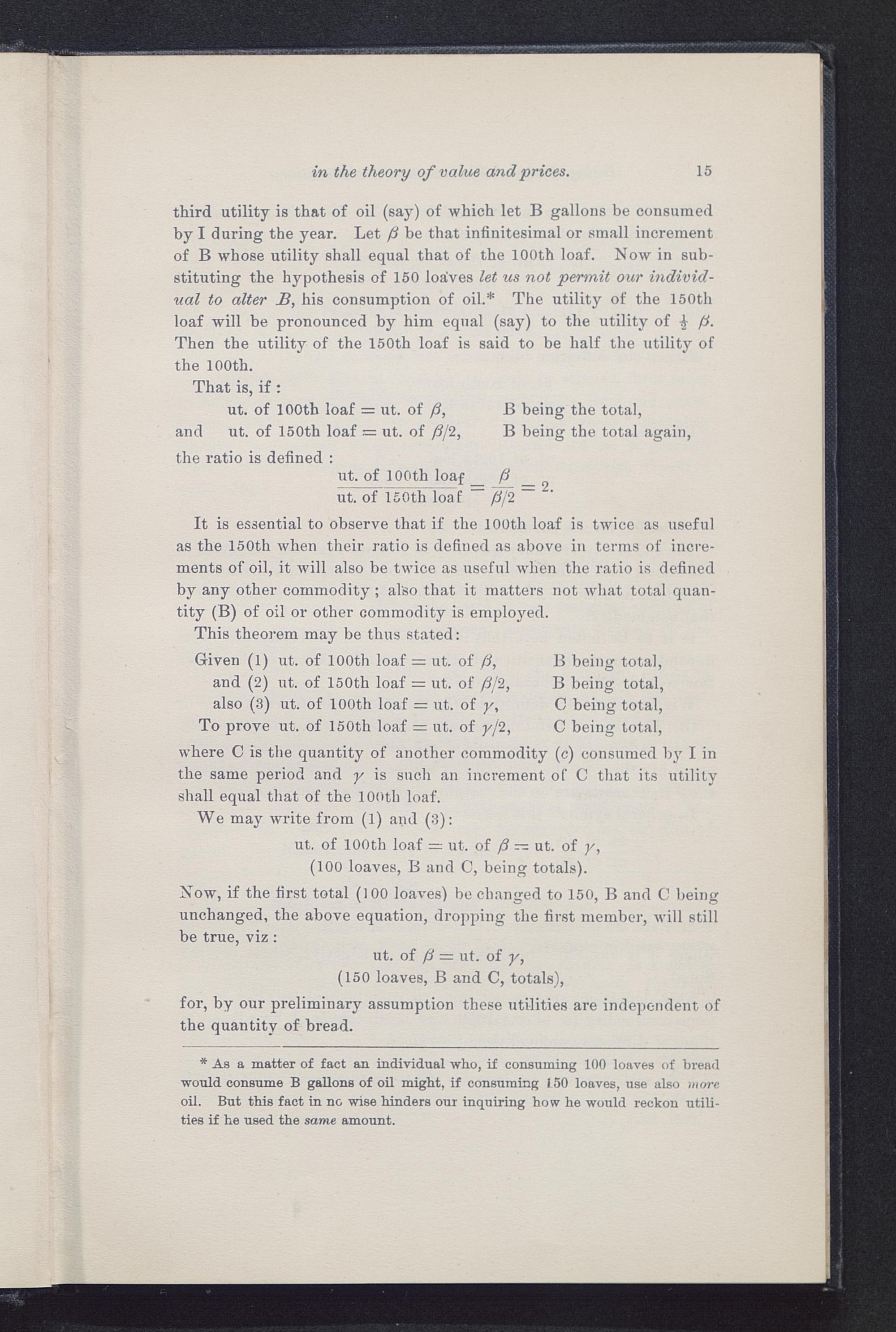 third utility is that of oil (say) of which let B gallons be consumedby I during the year. Let P be that infinitesimal or small incrementof B whose utility shall equal that of the 100th loaf. Now in sub-stituting the hypothesis of 150 loaves let us not permit our individ-ual to alter B, his consumption of oil.* The utility of the 150thloaf will be pronounced by him equal (say) to the utility of £ P-Then the utility of the 150th loaf is said to be half the utility ofthe 100th.