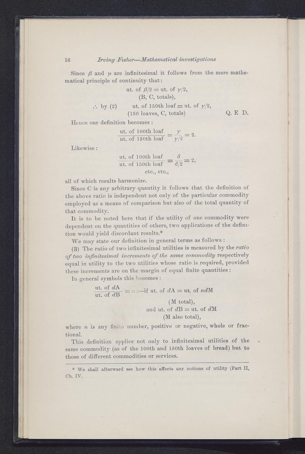 (3) The ratio of two infinitesimal utilities is measured by the ratioof two infinitesimal increments of the same commodity respectivelyequal in utility to the two utilities whose ratio is required, providedthese increments are on the margin of equal finite quantities: