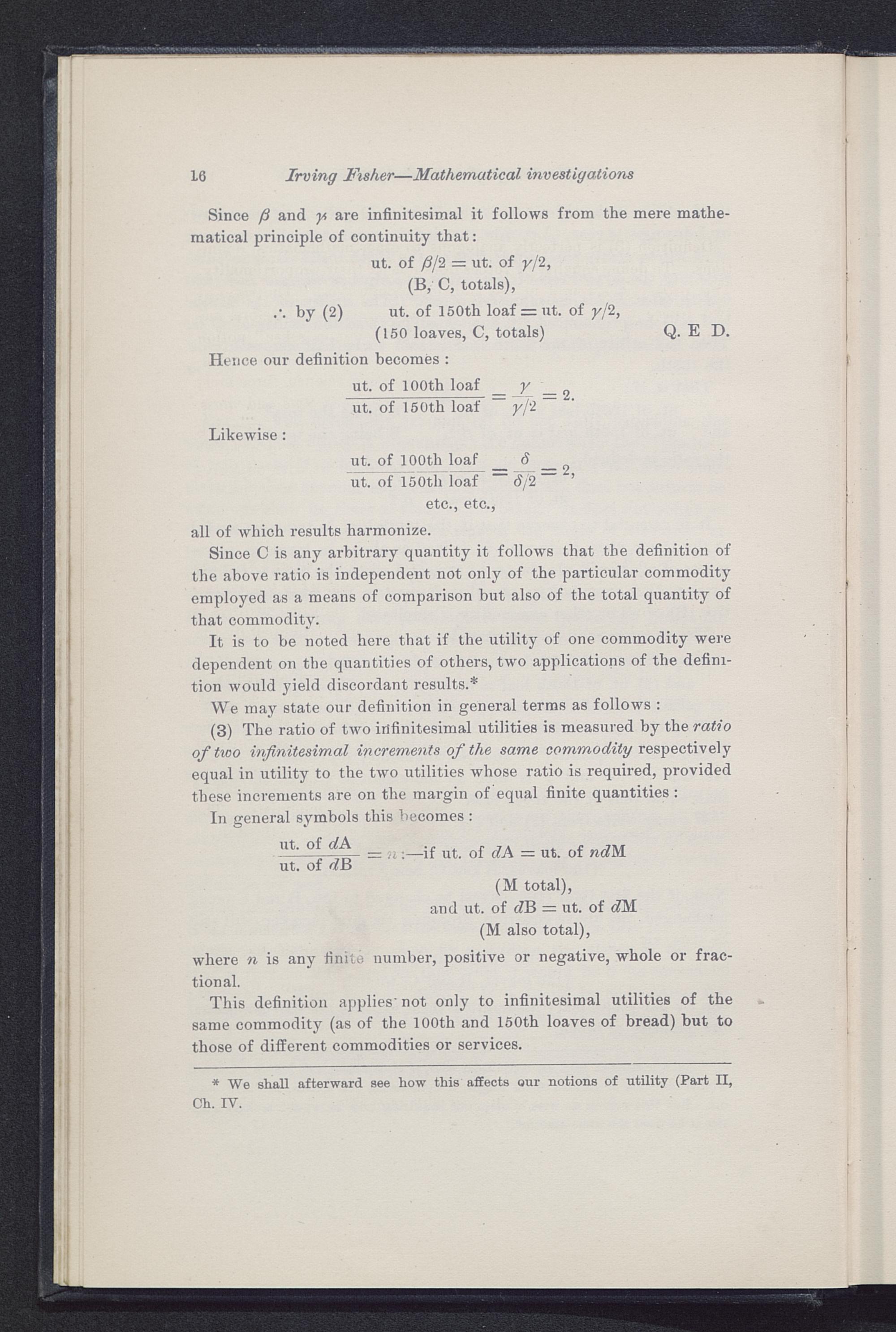 This definition applies' not only to infinitesimal utilities of thesame commodity (as of the 100th and 150th loaves of bread) but tothose of different commodities or services.