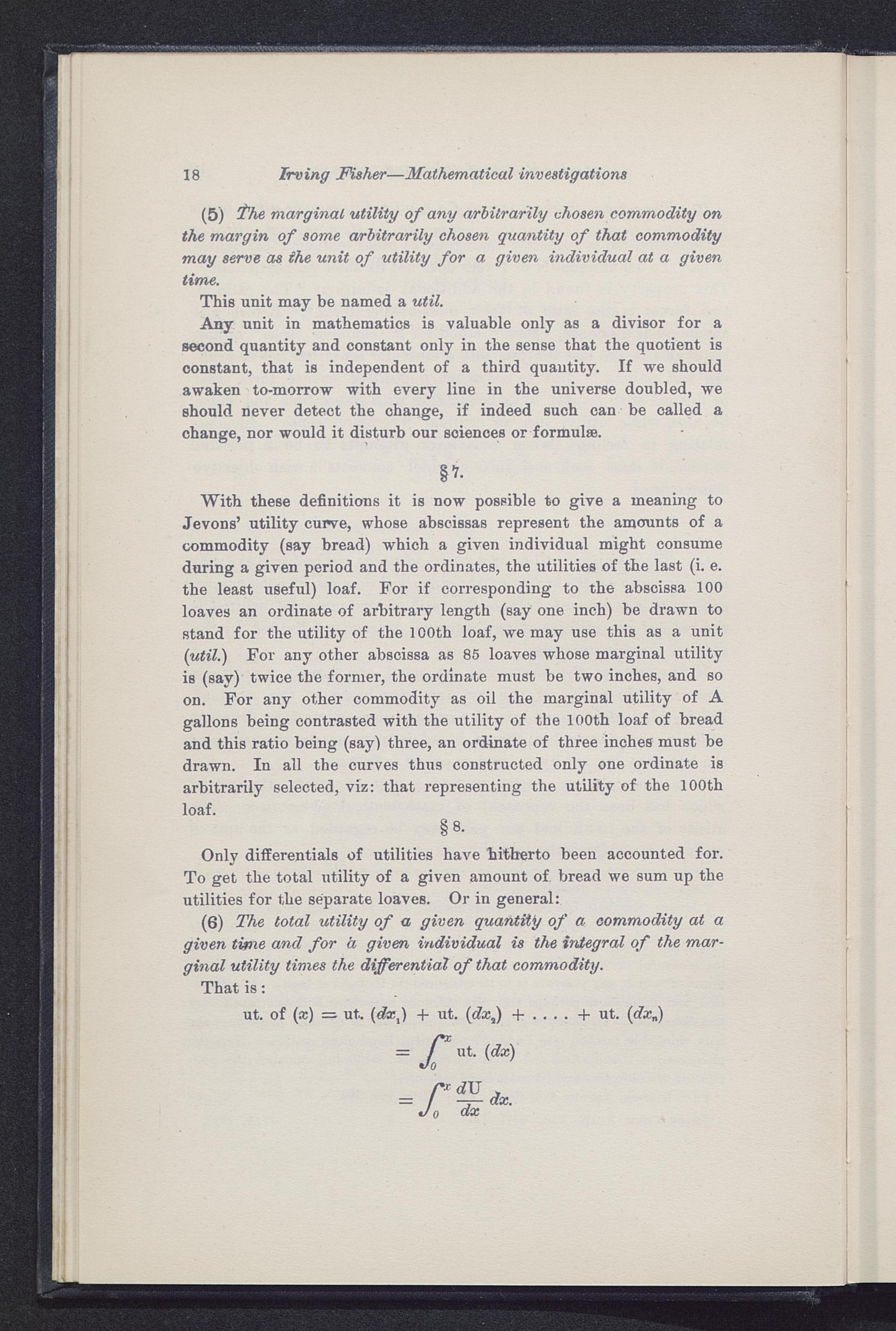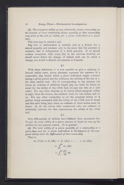 (6) The total utility of a given quantity of a commodity at agiven time and for a given individual is the integral of the mar-ginal utility times the differential of that commodity.