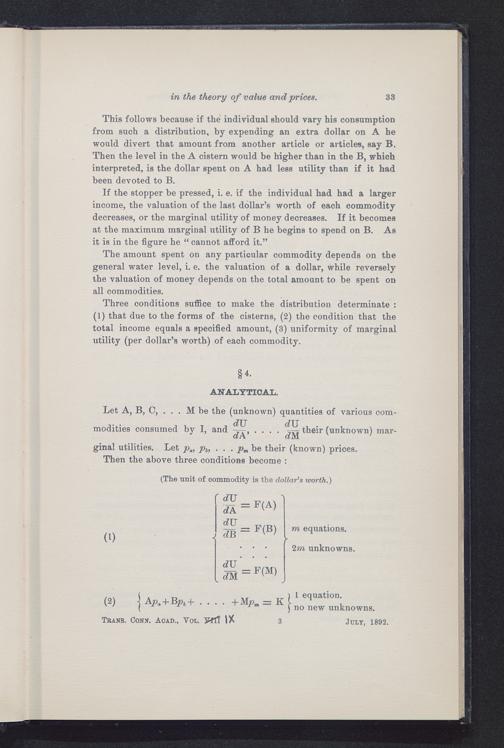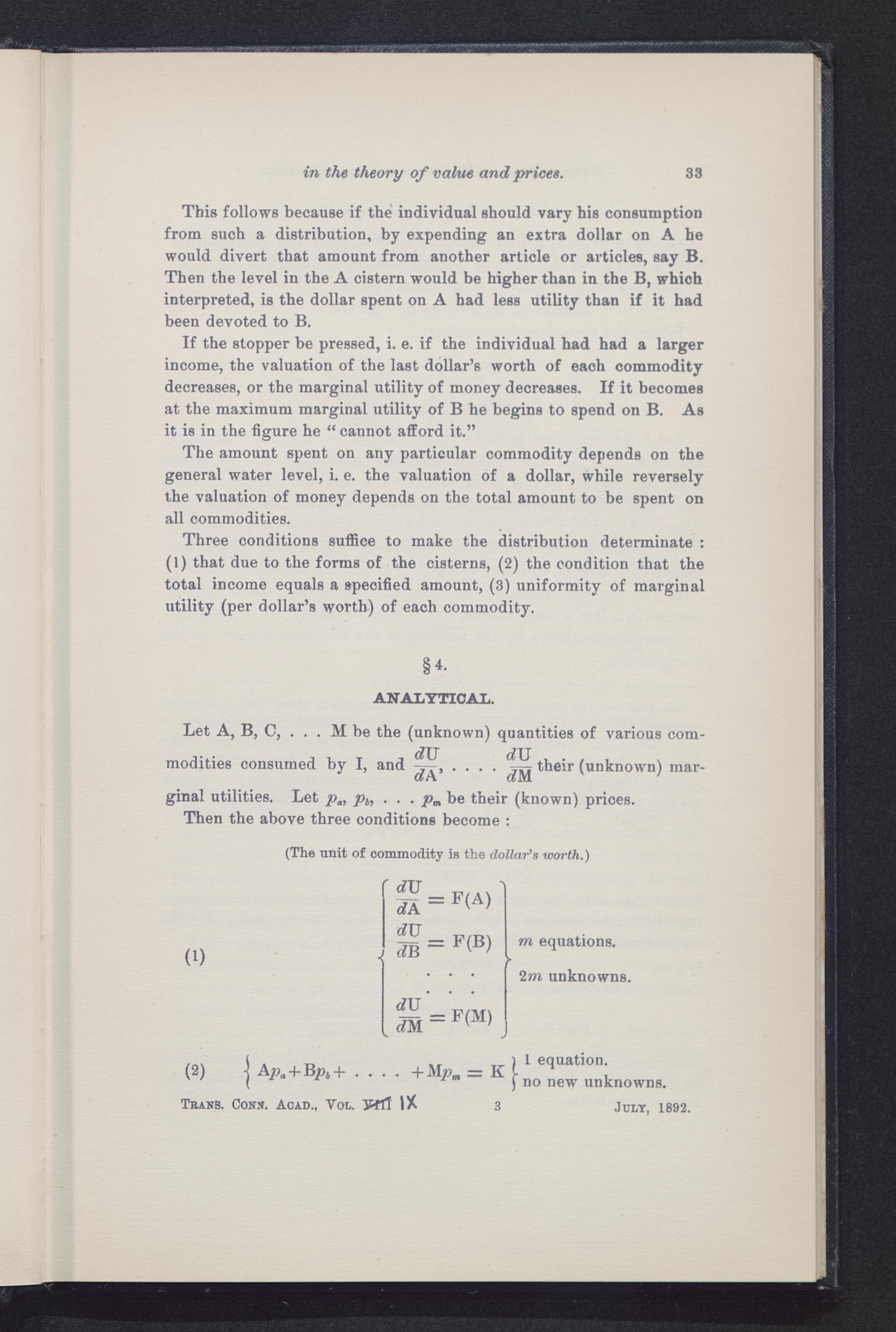 Three conditions suffice to make the distribution determinate :(1) that due to the forms of the cisterns, (2) the condition that thetotal income equals a specified amount, (3) uniformity of marginalutility (per dollar’s worth) of each commodity.