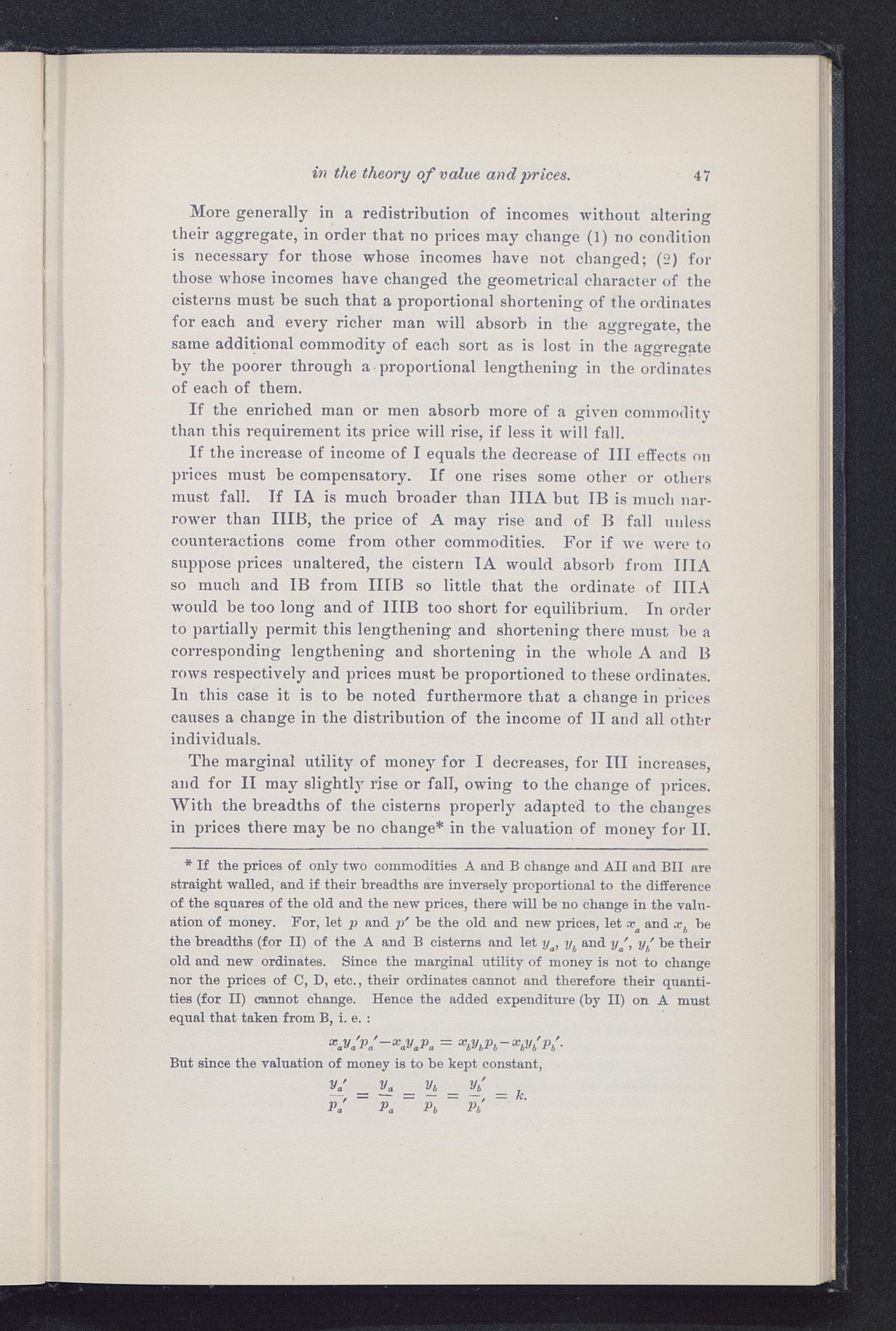 * If the prices of only two commodities A and B change and All and BII arestraight walled, and if their breadths are inversely proportional to the differenceof the squares of the old and the new prices, there will be no change in the valu-ation of money. For, let p and p' be the old and new prices, let x a and x b hethe breadths (for II) of the A and B cisterns and let y a> y t and y', y h ' be theirold and new ordinates. Since the marginal utility of money is not to changenor the prices of G, D, etc., their ordinates cannot and therefore their quanti-ties (for II) cannot change. Hence the added expenditure (by II) on A mustequal that taken from B, i. e. :
