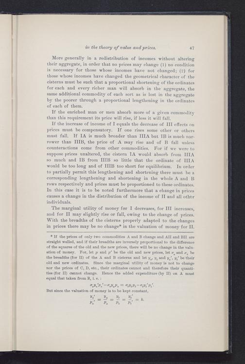 The marginal utility of money for I decreases, for III increases,and for II may slightly rise or fall, owing to the change of prices.With the breadths of the cisterns properly adapted to the changesin prices there may be no change* in the valuation of money for II.
