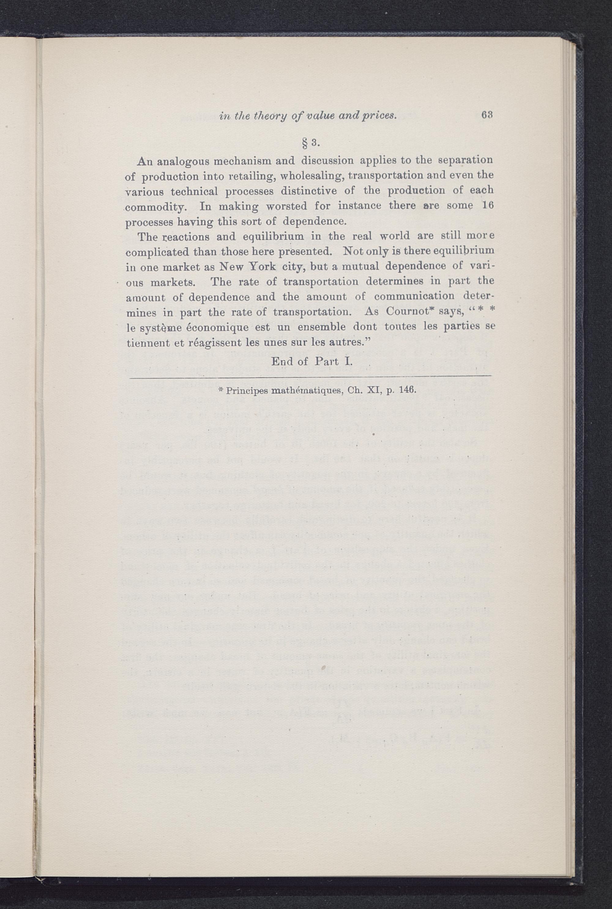 The reactions and equilibrium in the real world are still morecomplicated than those here presented. Not only is there equilibriumin one market as New York city , but a mutual dependence of vari-ous markets. The rate of transportation determines in part theamount of dependence and the amount of communication deter-mines in part the rate of transportation. As Cournot* says, “ * *le syst&me economique est un ensemble dont toutes les parties setiennent et reagissent les unes sur les autres.”