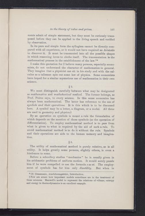 We must distinguish carefully between what maybe designatedas mathematics and mathematical method. The former belongs, asProf. Peirce says, to every science. In this sense economics hasalways been mathematical. The latter has reference to the use ofsymbols and their operations. It is this which is to be discussedhere. A symbol may be a letter, a diagram, or a model. All threeare used in geometry and physics.f