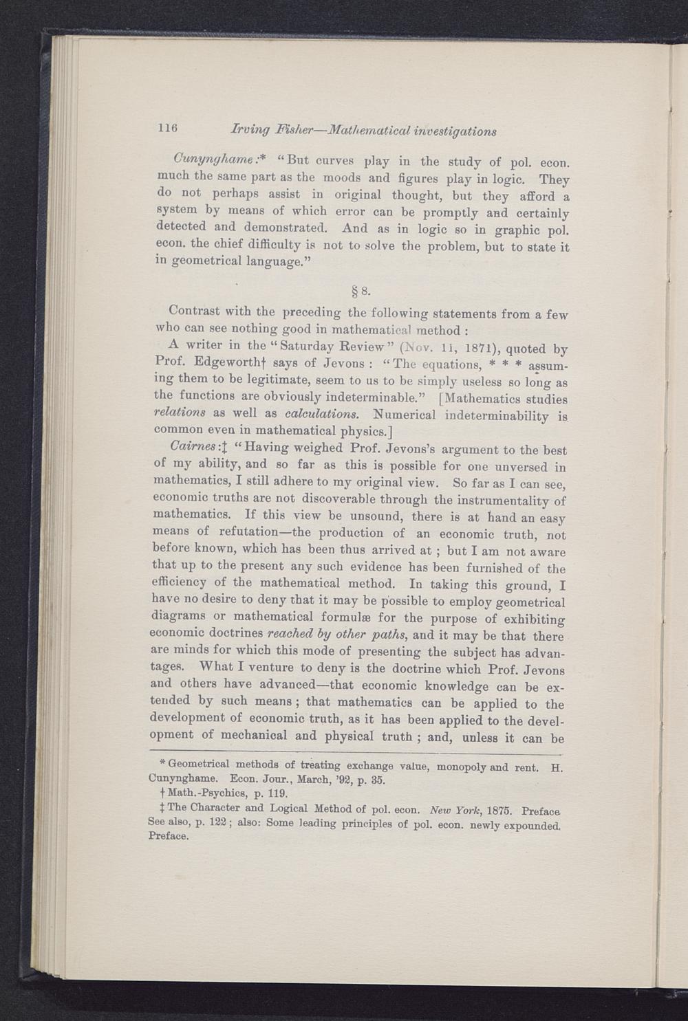 A writer in the “ Saturday Review ” (Nov. 11, 1871), quoted byProf. Edgeworthf says of Jevons : “The equations, * * * assum-ing them to be legitimate, seem to us to be simply useless so long asthe functions are obviously indeterminable.” [Mathematics studiesrelations as well as calculations. Numerical indeterminability iscommon even in mathematical physics.]