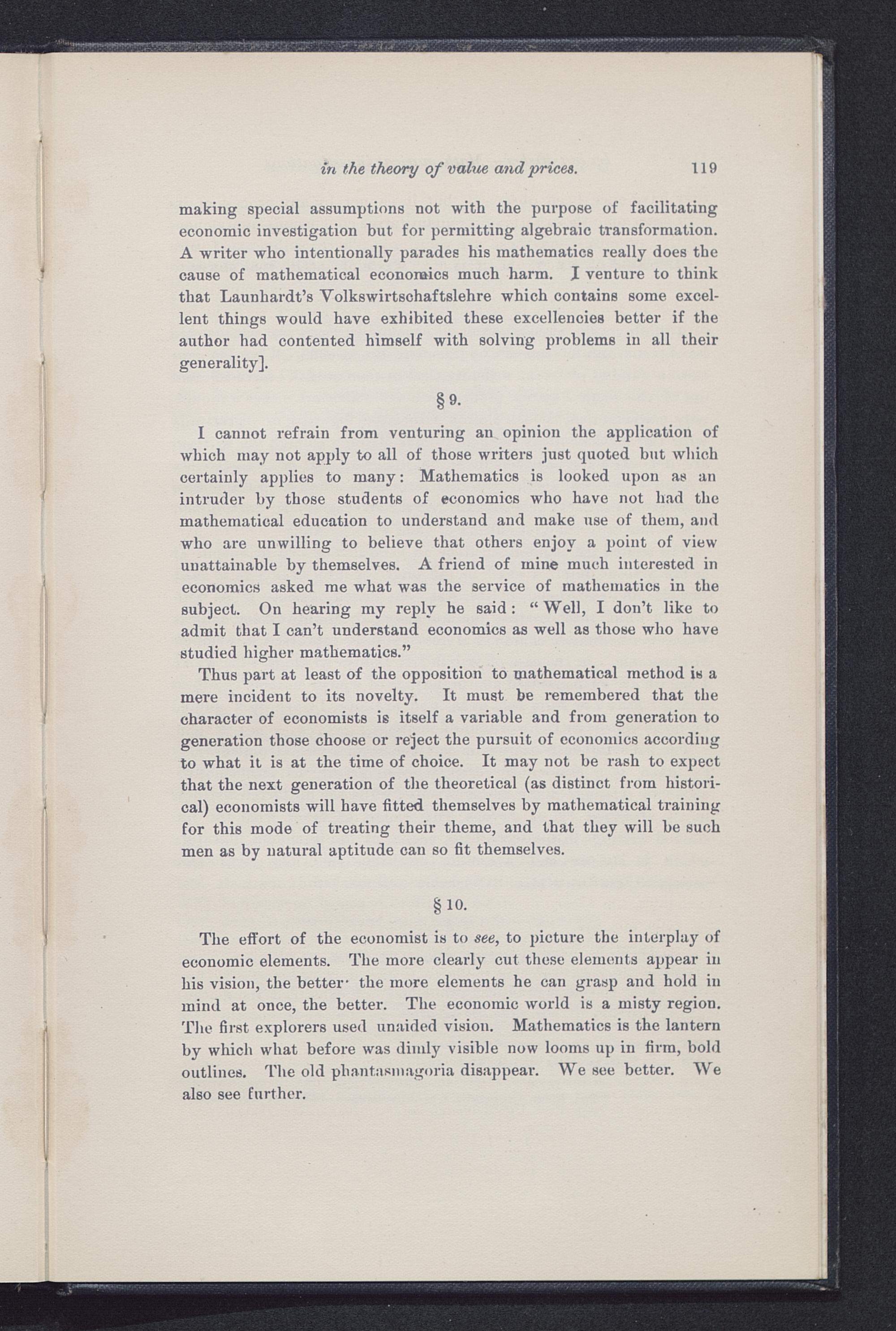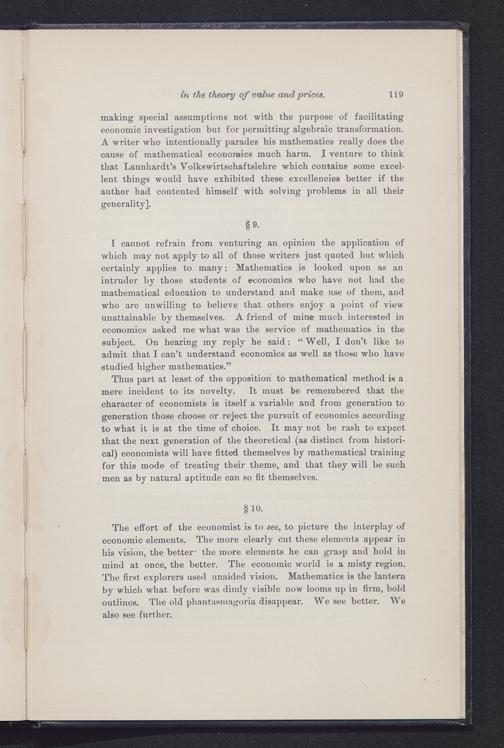 The effort of the economist is to see, to picture the interplay ofeconomic elements. The more clearly cut these elements appear inhis vision, the better - the more elements he can grasp and hold inmind at once, the better. The economic world is a misty region.The first explorers used unaided vision. Mathematics is the lanternby which what before was dimly visible now looms up in firm, boldoutlines. The old phantasmagoria disappear. We see better. Wealso see further.