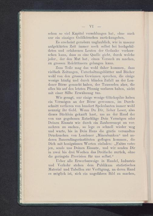 Wie gesagt, nur einige wenige Glückspilze habenein Vermögen an der Börse gewonnen, im Durch-schnitt verlieren von hundert Spekulanten immer wohlneunzig ihr Geld. Wenn Du Dir, lieber Leser, alsodieses Büchlein gekauft hast, um an der Hand dervon uns gegebenen Ratschläge Dein Vermögen oderDeinen Einsatz wie durch ein Zauberrezept zu ver-mehren zu suchen, so lege es schnell wieder wegund warte, bis in Dein Haus die gratis versandtenDrucksachen von Londoner „Minenbanken“ und an-deren Bauernfängerinstituten geflogen kommen, dieDich mit honigsüssen Worten einladen: „Eaites votrejeu, sende uns Deinen Einsatz, und wir senden Dirin zwei bis drei Wochen das Dreifache zurück, ohnedie geringste Provision für uns selbst.“ •