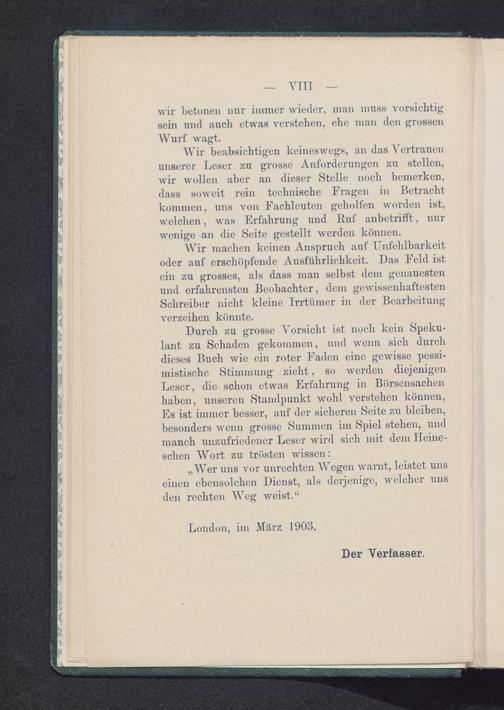 Durch zu grosse Vorsicht ist noch kein Speku-lant zu Schaden gekommen, und wenn sich durchdieses Buch wie ein roter Faden eine gewisse pessi-mistische Stimmung zieht, so werden diejenigenLeser, die schon etwas Erfahrung in Börsensachenhaben, unseren Standpunkt Avohl verstehen können,Es ist immer besser, auf der sicheren Seite zu bleiben,besonders Avenn grosse Summen im Spiel stehen, undmanch unzufriedener Leser Avird sich mit dem Heine-schen Wort zu trösten Avissen: