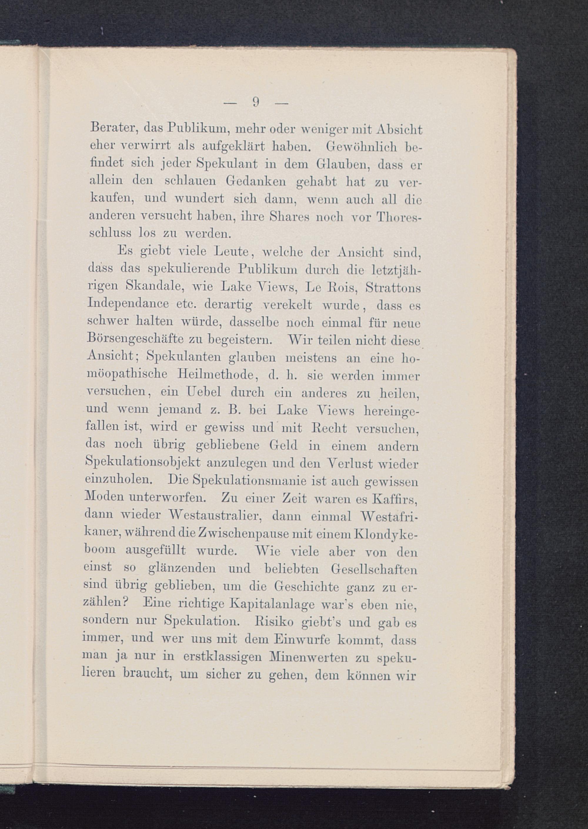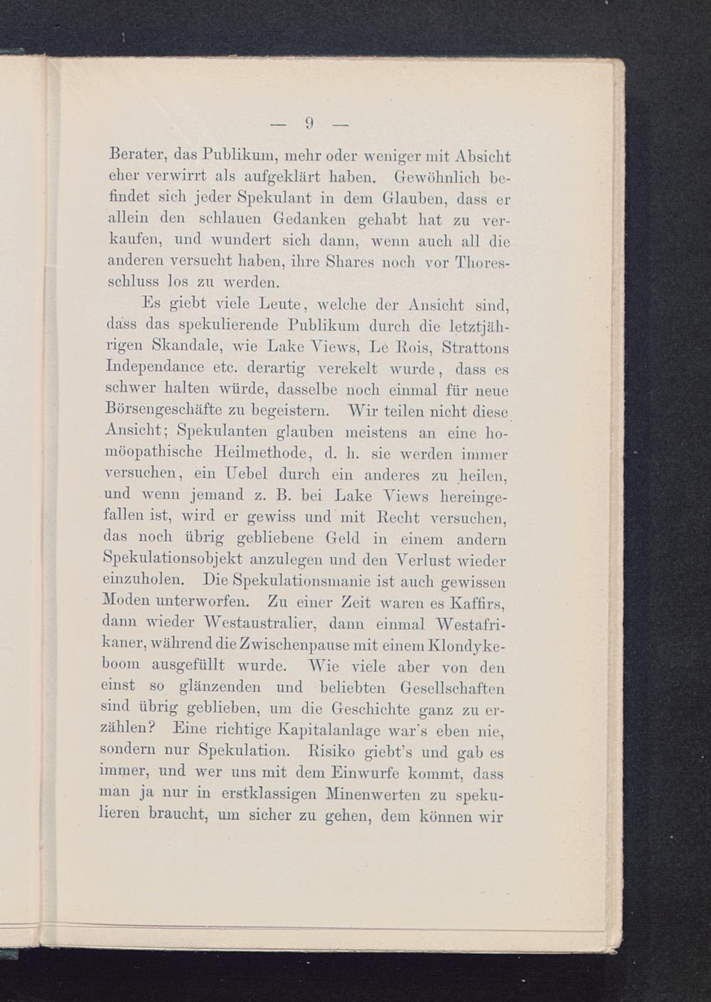 Es giebt viele Leute, welche der Ansicht sind,dass das spekulierende Publikum durch die letztjäh-rigen Skandale, wie Lake Yiews, Le Rois, StrattonsIndependance etc. derartig verekelt wurde, dass esschwer halten würde, dasselbe noch einmal für neueBörsengeschäfte zu begeistern. Wir teilen nicht dieseAnsicht; Spekulanten glauben meistens an eine ho-möopathische Heilmethode, d. h. sie werden immerversuchen, ein Uebel durch ein anderes zu heilen,und wenn jemand z. B. bei Lake Yiews hereinge-fallen ist, wird er gewiss und mit liecht versuchen,das noch übrig gebliebene Geld in einem andernSpekulationsobjekt anzulegen und den Yerlust wiedereinzuholen. Die Spekulationsmanie ist auch gewissenModen unterworfen. Zu einer Zeit waren es Kaffirs,dann wieder Westaustralier, dann einmal Westafri-kaner, während die Zwischenpause mit einem Kloiulyke-booin ausgefüllt wurde. Wie viele aber von deneinst so glänzenden und beliebten Gesellschaftensind übrig geblieben, um die Geschichte ganz zu er-zählen? Eine richtige Kapitalanlage war’s eben nie,sondern nur Spekulation. Risiko giebt’s und gab esimmer, und wer uns mit dem Einwurfe kommt, dassman ja nur in erstklassigen Minenwerten zu speku-lieren braucht, um sicher zu gehen, dem können wir