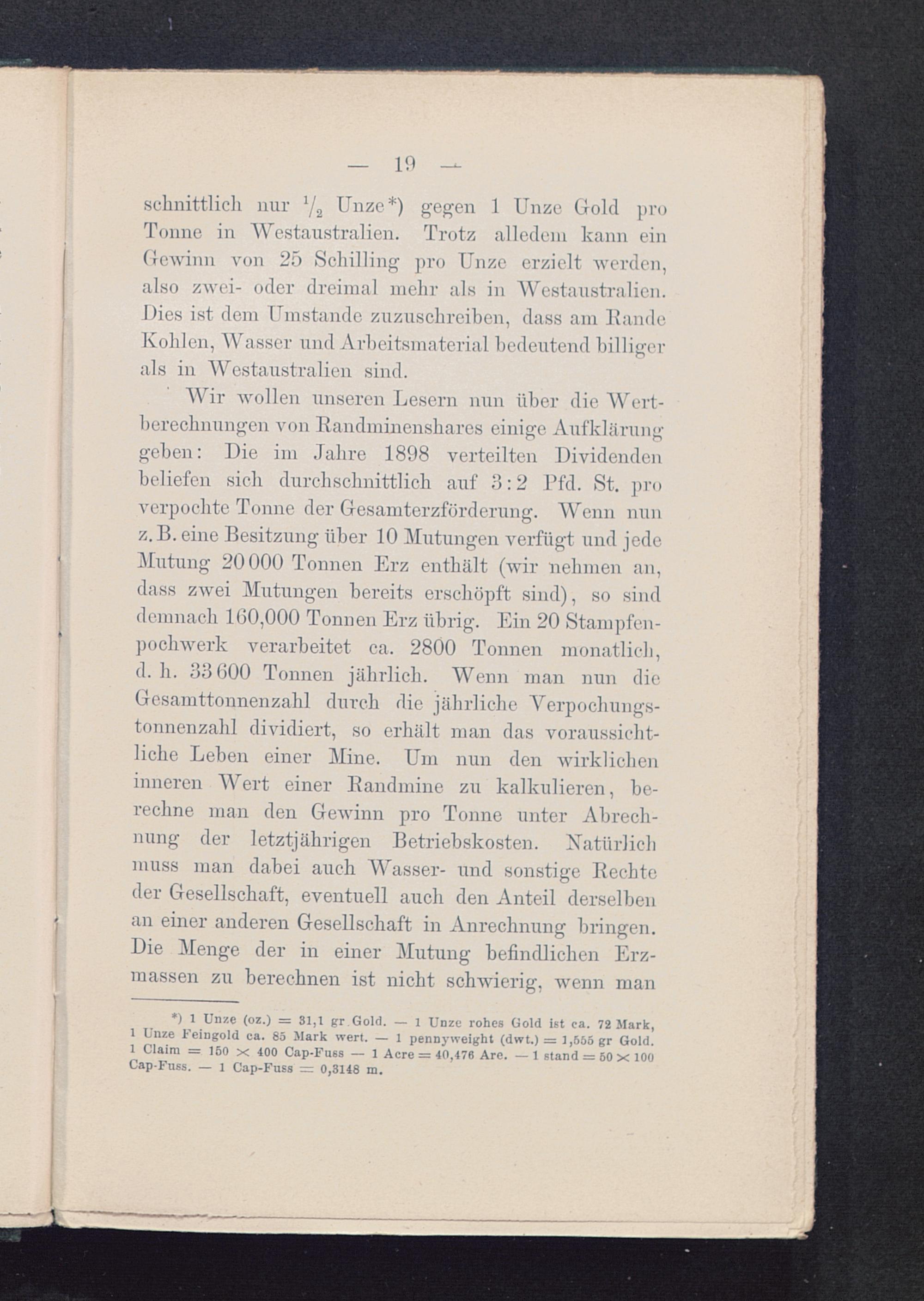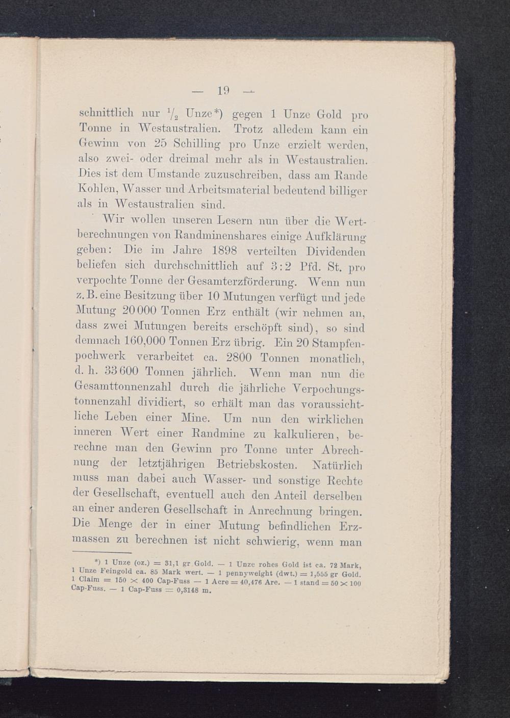 *) 1 Unze (oz.) = 31,1 gr.GoId. — l Unze rohes Gold i6t ca. 72 Mark,1 Unze Feingold ca. 85 Mark wert. — 1 pennyweight (dwt.) := 1,566 gr Gold.