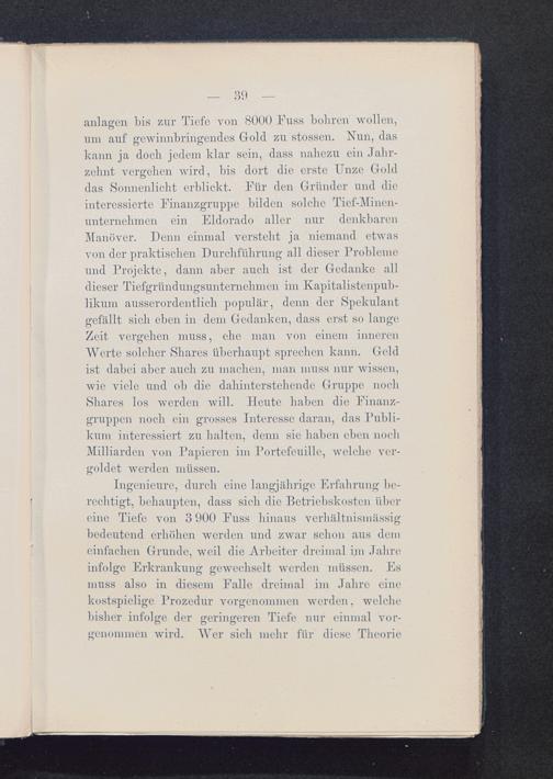 anlagen bis zur Tiefe von 8000 Fuss bohren' wollen,um auf gewinnbringendes Gold zu stossen. Nun, daskann ja doch jedem klar sein, dass nahezu ein Jahr-zehnt vergehen wird, bis dort die erste Unze Golddas Sonnenlicht erblickt. Für den Gründer und dieinteressierte Finanzgruppe bilden solche Tief-Mi nen-unternelnnen ein Eldorado aller nur denkbarenManöver. Denn einmal versteht ja niemand etwasvon der praktischen Durchführung all dieser Problemeund Projekte, dann aber auch ist der Gedanke alldieser Tiefgründungsunternehmen im Kapitalistenpub-likum ausserordentlich populär, denn der Spekulantgefällt sich eben in dem Gedanken, dass erst so langeZeit vergehen muss, ehe man von einem innerenWerte solcher Shares überhaupt sprechen kann. Geldist dabei aber auch zu machen, man muss nur wissen,wie viele und ob die dahinterstehende Gruppe nochShares los werden will. Heute haben die Finanz-gruppen noch ein grosses Interesse daran, das Publi-kum interessiert, zu halten, denn sie haben eben nochMilliarden von Papieren im Portefeuille, welche ver-goldet werden müssen.