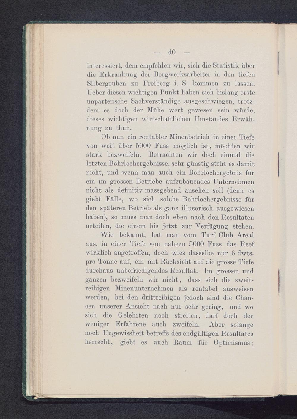 Wie bekannt, hat man vom Turf Club Arealaus, in einer Tiefe von nahezu 5000 Fuss das Reefwirklich angetroffen, doch wies dasselbe nur 6 dwts.pro Tonne auf, ein mit Rücksicht auf die grosse Tiefedurchaus unbefriedigendes Resultat. Im grossen undganzen bezweifeln wir nicht, dass sich die zweit-reihigen Minenunternehmen als rentabel ausweisenwerden, bei den drittreihigen jedoch sind die Chan-cen unserer Ansicht nach nur sehr gering, und wosich die Gelehrten noch streiten, darf doch derweniger Erfahrene auch zweifeln. Aber solangenoch Ungewissheit betreffs des endgültigen Resultatesherrscht, giebt es auch Raum für Optimismus;