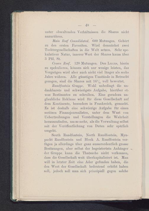 Main Reef Consolidated. 000 Mutungen. Gehörtzu den ersten Favoriten. Wird demnächst zweiTochtergesellschaften in die Welt setzen. Sehr spe-kulativer Natur, innerer Wert der Shares kaum über3 Pfd. St.