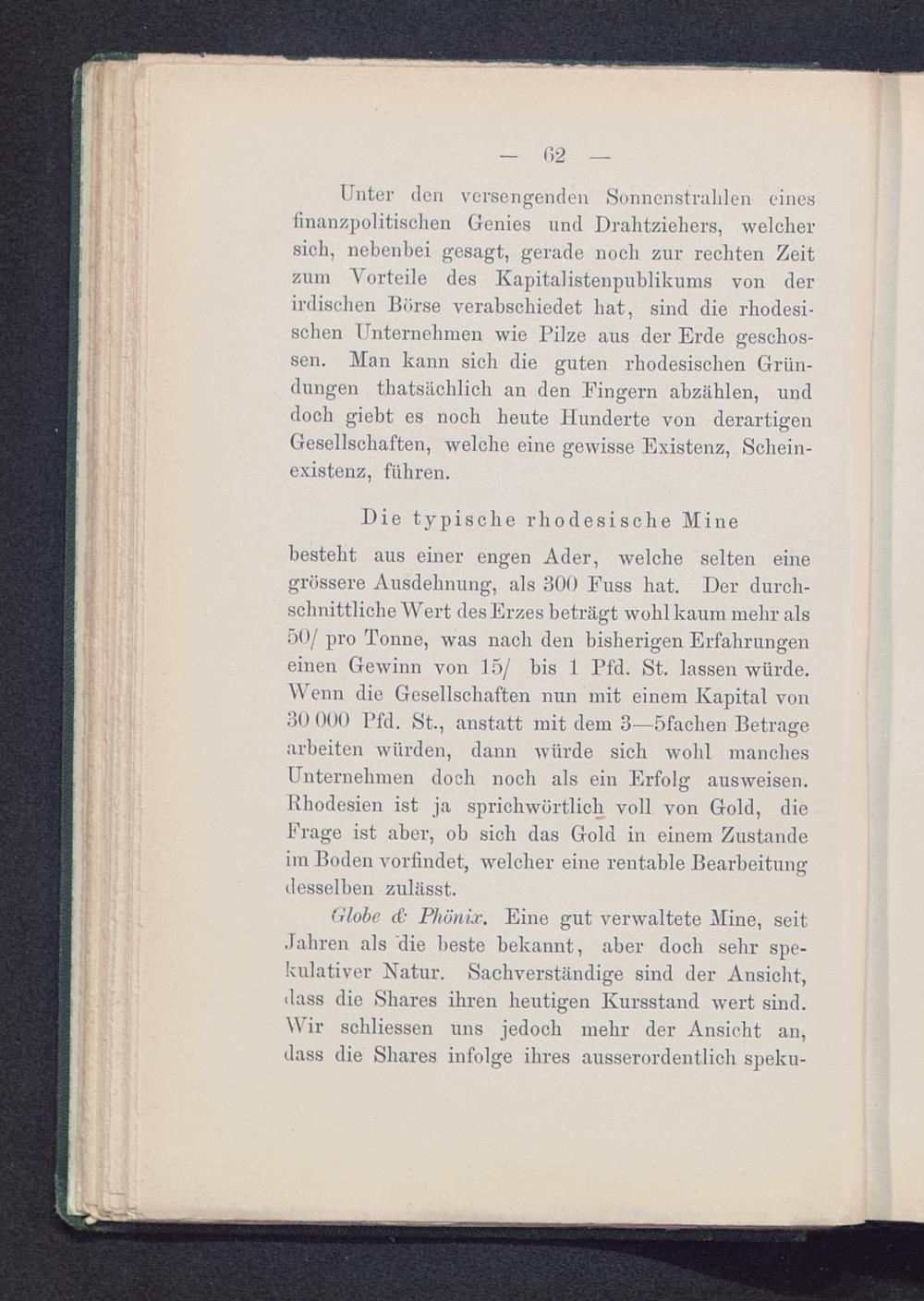 Unter den versengenden Sonnenstrahlen einesfinanzpolitischen Genies und Drahtziehers, welchersich, nebenbei gesagt, gerade noch zur rechten Zeitzum Vorteile des Kapitalistenpublikums von derirdischen Börse verabschiedet hat, sind die rhodesi-schen Unternehmen wie Pilze aus der Erde geschos-sen. Man kann sich die guten rhodesischen Grün-dungen thatsächlich an den Eingern abzählen, unddoch giebt es noch heute Hunderte von derartigenGesellschaften, welche eine gewisse Existenz, Schein-existenz, führen.