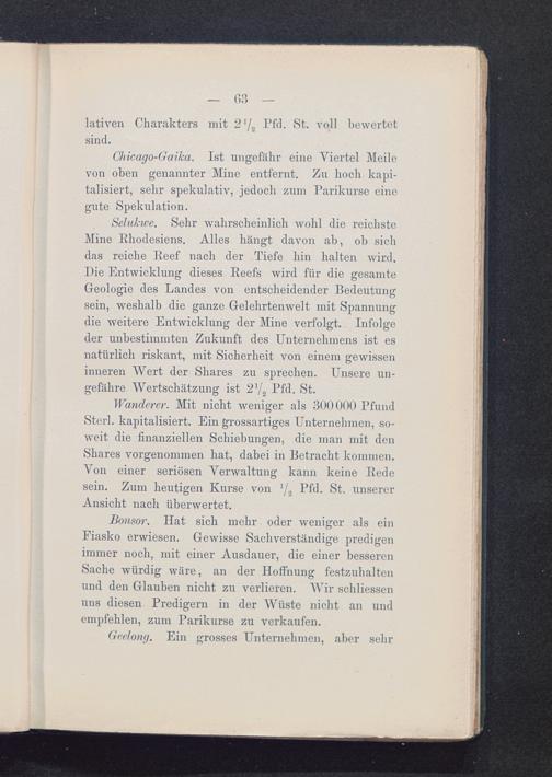 Chicago -Gaika. Ist ungefähr eine Viertel Meilevon oben genannter Mine entfernt. Zu hoch kapi-talisiert, sehr spekulativ, jedoch zum Parikurse einegute Spekulation.