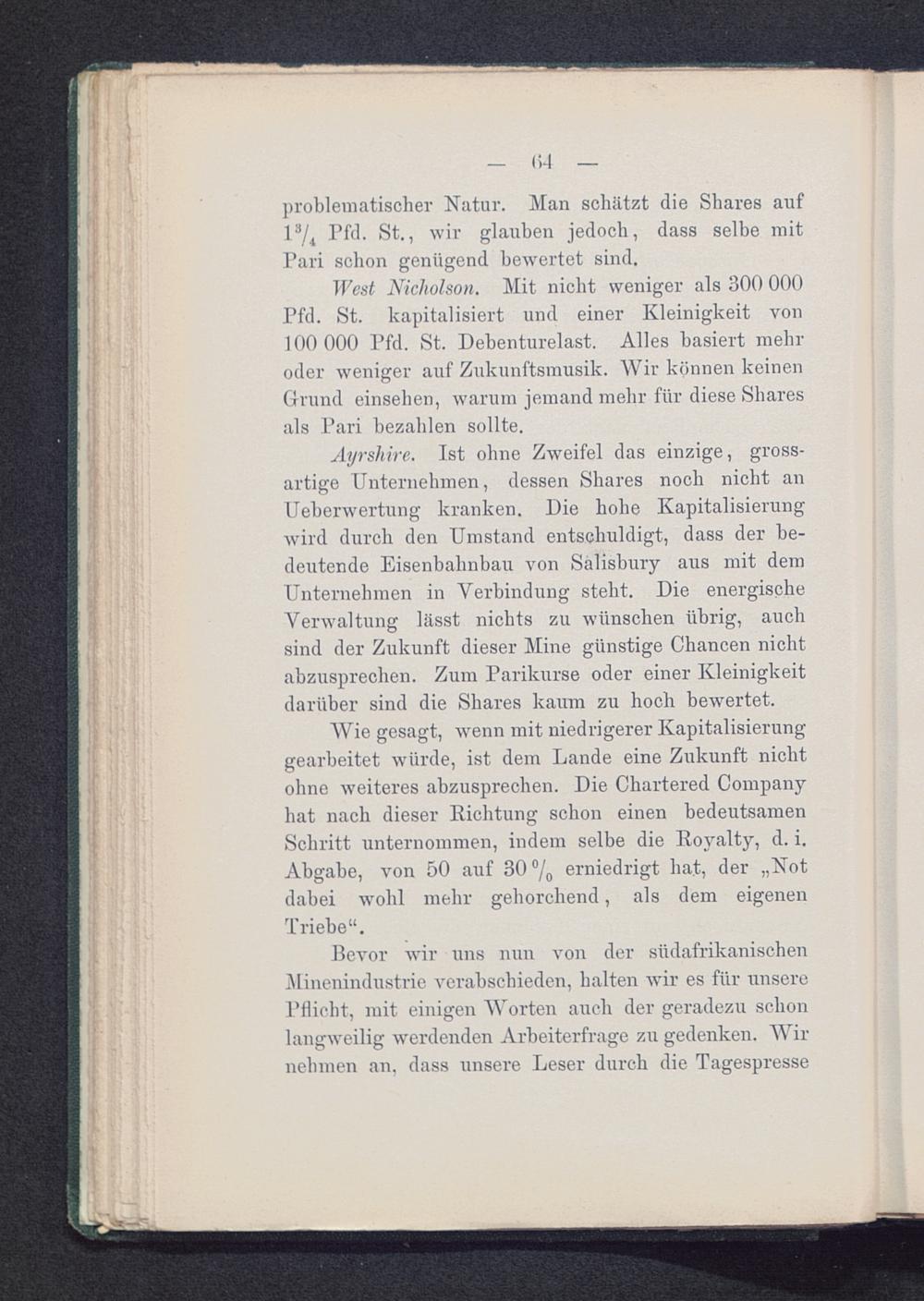 West Nicholson. Mit nicht weniger als 300 000Pfd. St. kapitalisiert und einer Kleinigkeit von100 000 Pfd. St. Debenturelast. Alles basiert mehroder weniger auf Zukunftsmusik. Wir können keinenGrund einsehen, warum jemand mehr für diese Sharesals Pari bezahlen sollte.