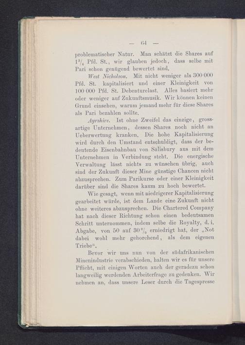 Ayrshire. Ist ohne Zweifel das einzige, gross-artige Unternehmen, dessen Shares noch nicht anUeberwertung kranken. Die hohe Kapitalisierungwird durch den Umstand entschuldigt, dass der be-deutende Eisenbahnbau von Salisbury aus mit demUnternehmen in Verbindung steht. Die energischeVerwaltung lässt nichts zu wünschen übrig, auchsind der Zukunft dieser Mine günstige Chancen nichtabzusprechen. Zum Parikurse oder einer Kleinigkeitdarüber sind die Shares kaum zu hoch bewertet.