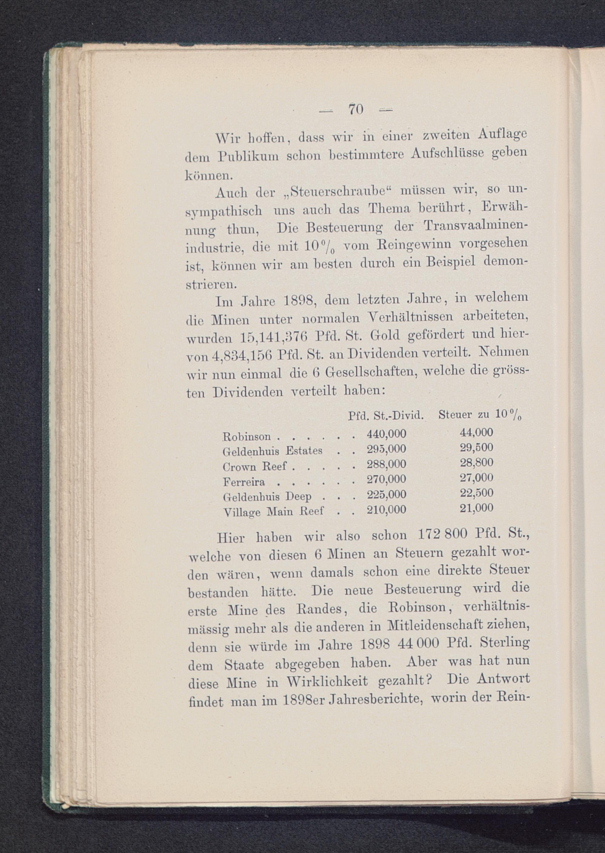 liier haben wir also schon 172 800 Pfd. St.,welche von diesen 0 Minen an Steuern gezahlt wor-den wären, wenn damals schon eine direkte Steuerbestanden hätte. Die neue Besteuerung wird dieerste Mine des Bandes, die Bobinson, verhältnis-mässig mehr als die anderen in Mitleidenschaft ziehen,denn sie würde im Jahre 1898 44 000 Pfd. Sterlingdem Staate abgegeben haben. Aber was hat nundiese Mine in Wirklichkeit gezahlt? Die Antwortfindet man im 1898er Jahresberichte, worin der Bein-