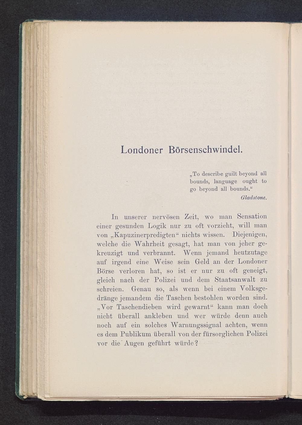 In unserer nervösen Zeit, wo man Sensationeiner gesunden Logik nur zu oft vorzieht, will manvon „Kapuzinerpredigten“ nichts Avissen. Diejenigen,Avelche die Wahrheit gesagt, hat man \ r on jeher ge-kreuzigt und verbrannt. Wenn jemand heutzutageauf irgend eine Weise sein Geld an der LondonerBörse verloren hat, so ist er nur zu oft geneigt,gleich nach der Polizei und dem Staatsanwalt zuschreien. Genau so, als wenn bei einem Volksge-dränge jemandem die Taschen bestohlen Avorden sind.„Vor Taschendieben Avird gewarnt“ kann man dochnicht überall ankleben und AVer Avtirde denn auchnoch auf ein solches Warnungssignal achten, Avennes dem Publikum überall \'on der fürsorglichen Polizeivor die Augen geführt Avürde?