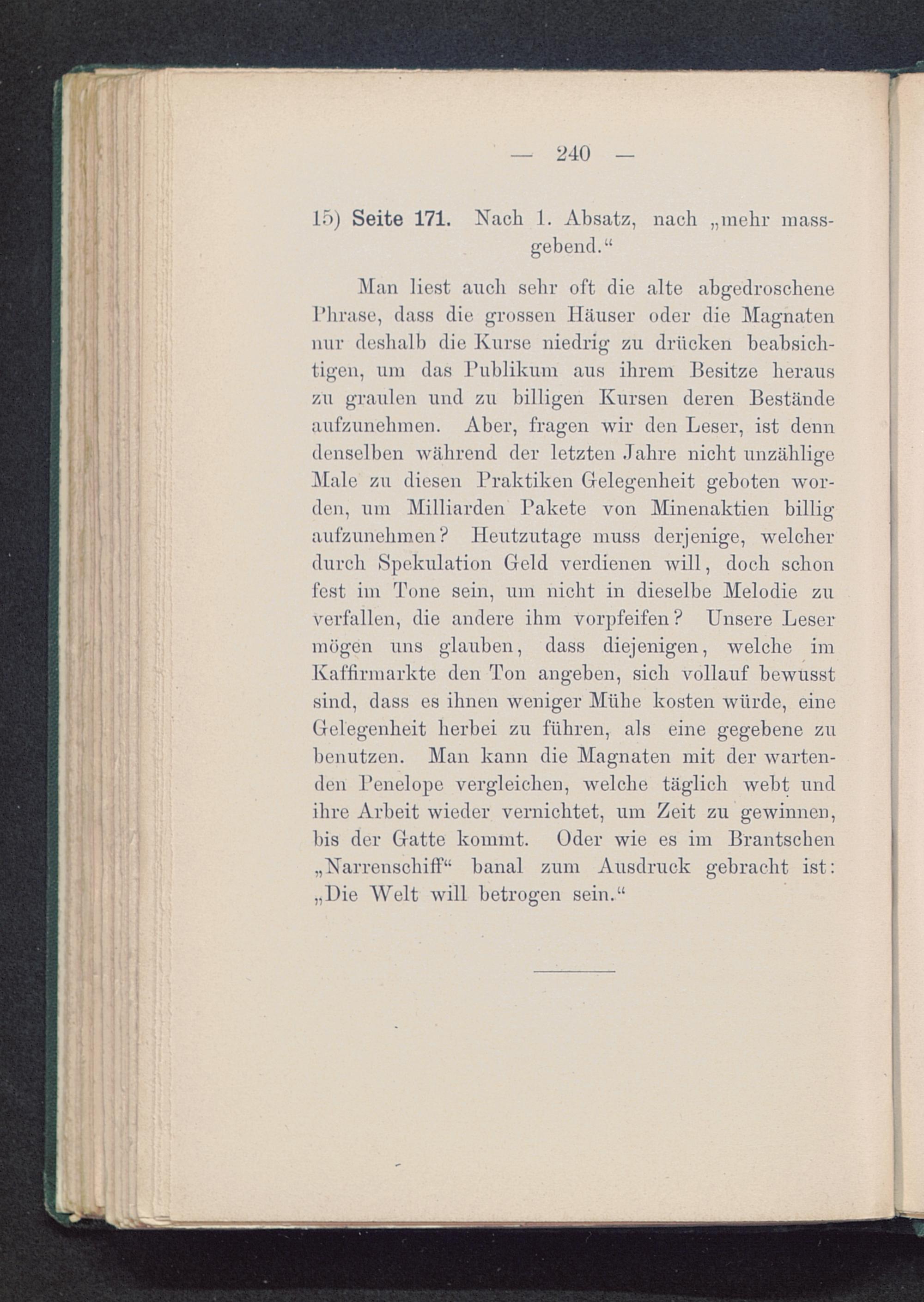Man liest auch sehr oft die alte abgedroschenePhrase, dass die grossen Iläuser oder die Magnatennur deshalb die Kurse niedrig zu drücken beabsich-tigen, um das Publikum aus ihrem Besitze herauszu graulen und zu billigen Kursen deren Beständeaufzunehmen. Aber, fragen wir den Leser, ist denndenselben während der letzten Jahre nicht unzähligeMale zu diesen Praktiken Gelegenheit geboten wor-den, um Milliarden Pakete von Minenaktien billigaufzunehmen? Heutzutage muss derjenige, welcherdurch Spekulation Geld verdienen will, doch schonfest im Tone sein, um nicht in dieselbe Melodie zuverfallen, die andere ihm vorpfeifen? Unsere Lesermögen uns glauben, dass diejenigen, welche imKaffirmarkte den Ton angeben, sich vollauf bewusstsind, dass es ihnen weniger Mühe kosten würde, eineGelegenheit herbei zu führen, als eine gegebene zubenutzen. Man kann die Magnaten mit der warten-den Penelope vergleichen, welche täglich weht undihre Arbeit wieder vernichtet, um Zeit zu gewinnen,bis der Gatte kommt. Oder wie es im Brantschen„Narrenschiff“ banal zum Ausdruck gebracht ist:„Hie Welt will betrogen sein.“
