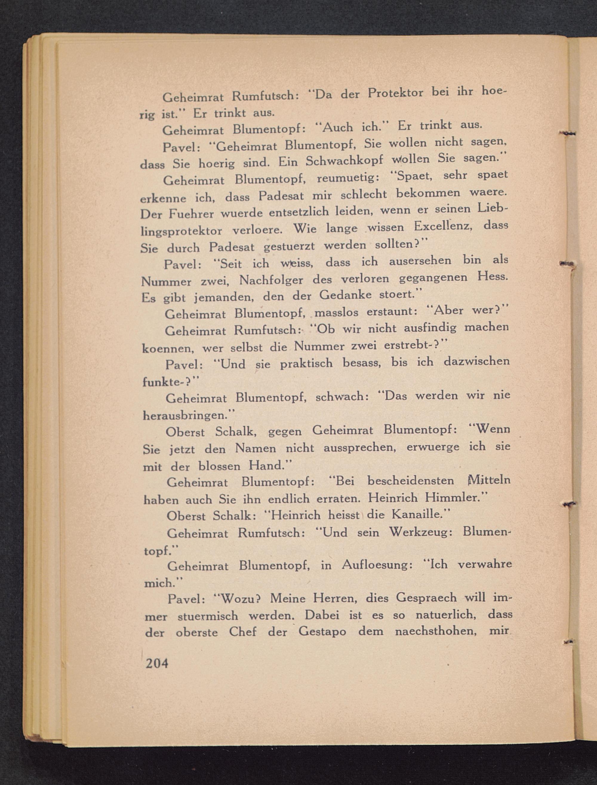 Pavel: “Wozu? Meine Herren, dies Gespraech will im-mer stuermisch werden. Dabei ist es so natuerlich, dassder oberste Chef der Gestapo dem naechsthohen, mir