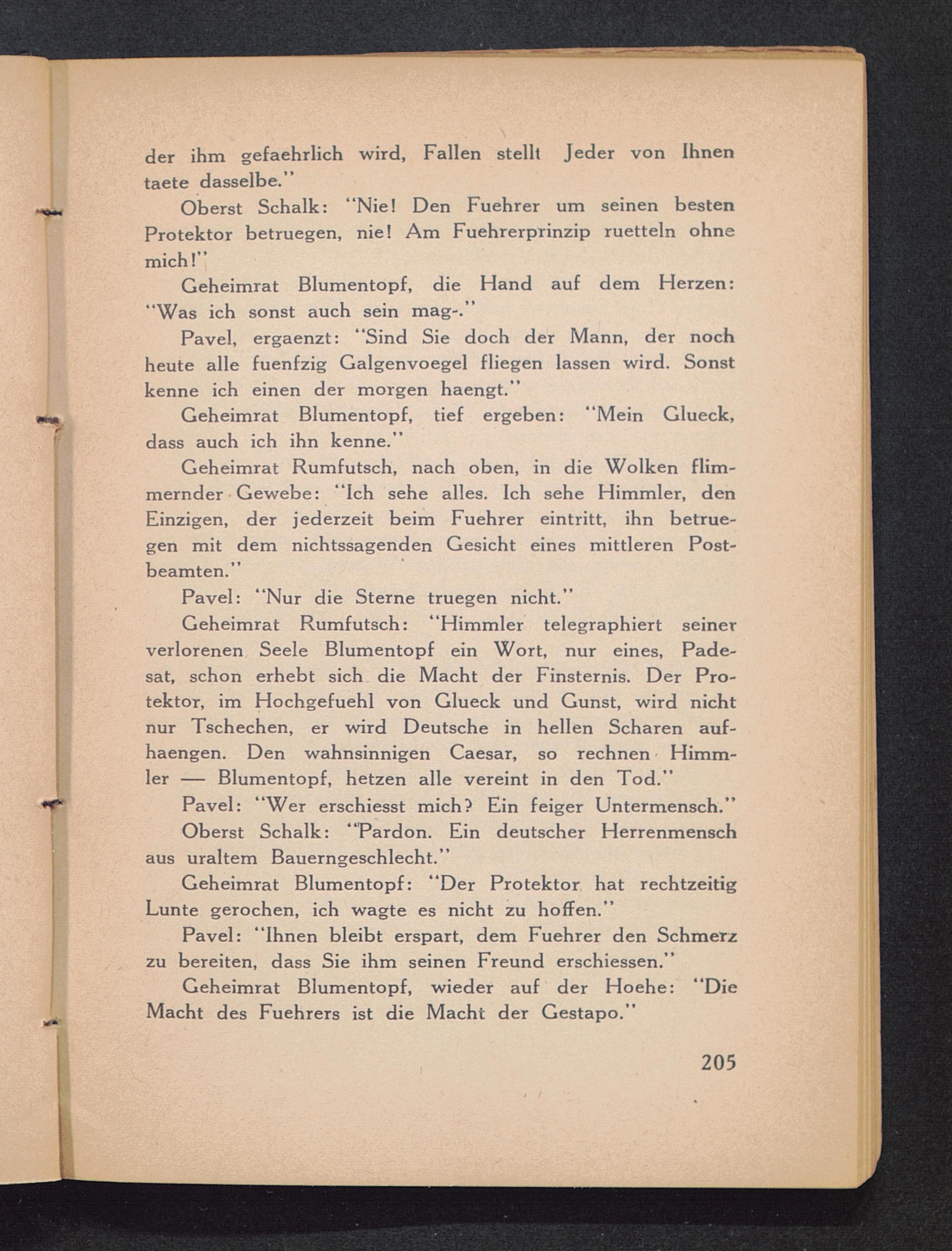 Geheimrat Rumfutsch: “Himmler telegraphiert seinerverlorenen Seele Blumentopf ein Wort, nur eines, Pade-sat, schon erhebt sich die Macht der Finsternis. Der Pro-tektor, im Hochgefuehl von Glueck und Gunst, wird nichtnur Tschechen, er wird Deutsche in hellen Scharen auf-haengen. Den wahnsinnigen Caesar, so rechnen Himm-ler — Blumentopf, hetzen alle vereint in den Tod.”