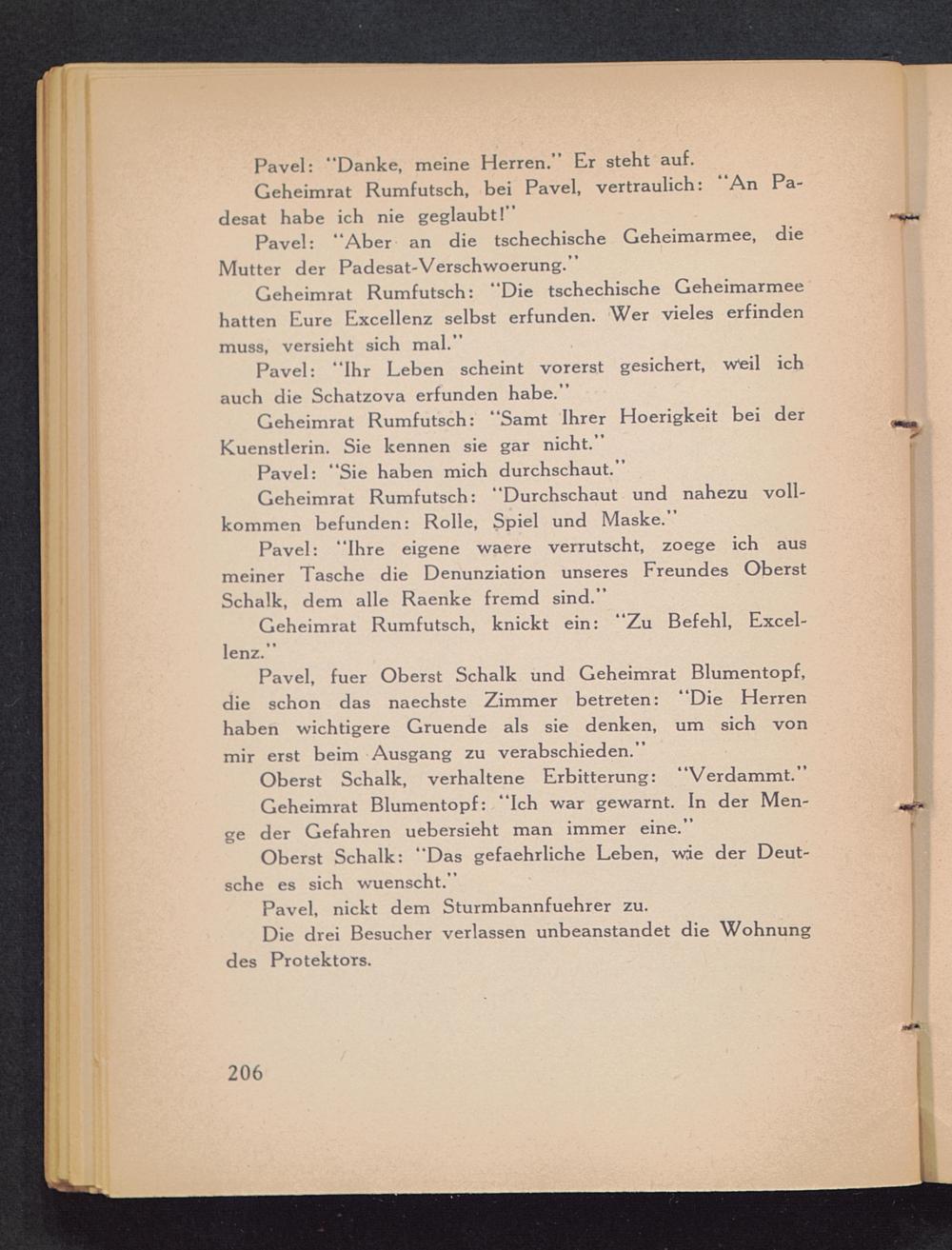 Pavel, fuer Oberst Schalk und Geheimrat Blumentopf,die schon das naechste Zimmer betreten: “Die Herrenhaben wichtigere Gruende als sie denken, um sich vonmir erst beim Ausgang zu verabschieden.”