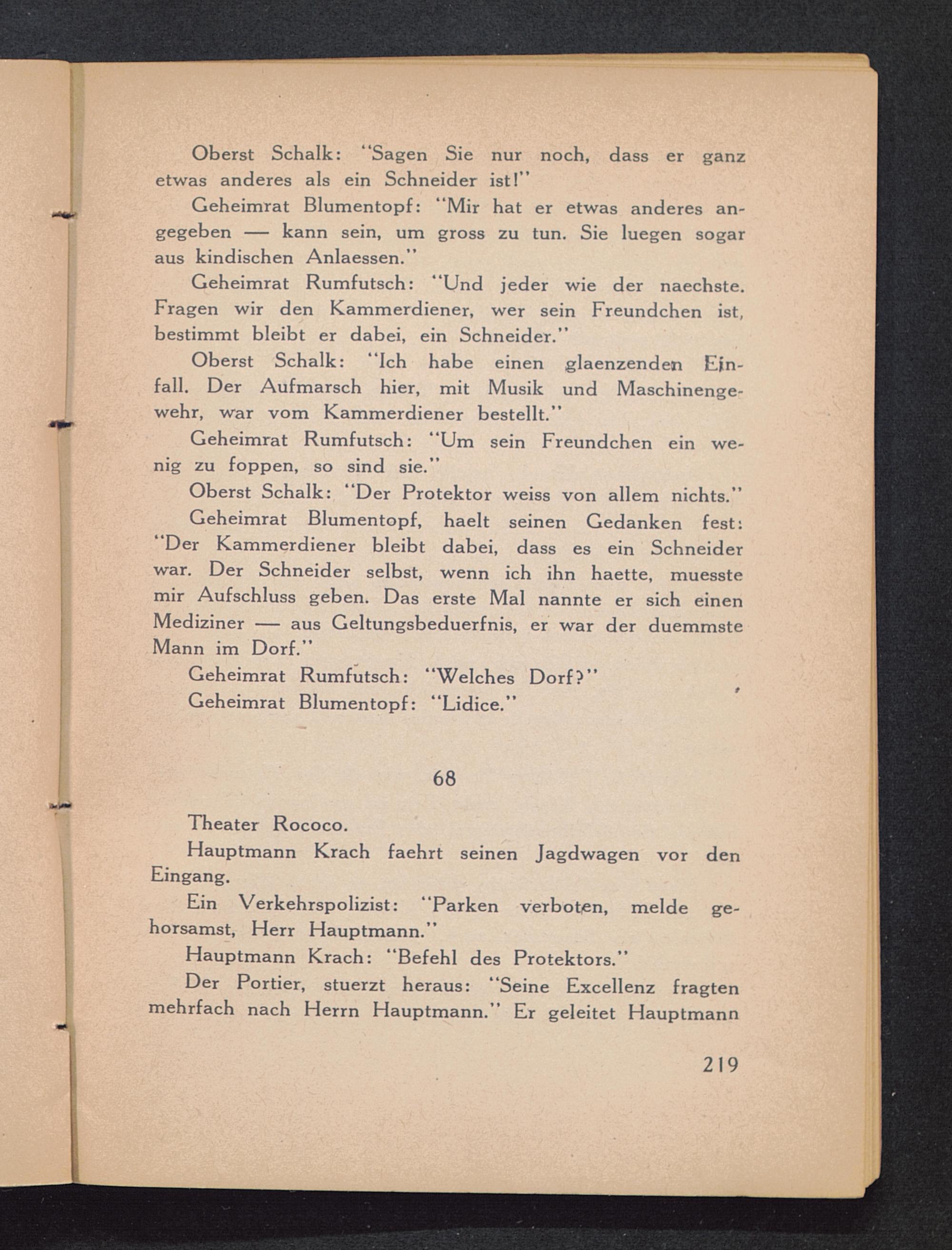 Oberst Schalk: “Ich habe einen glaenzenden Ein-fall. Der Aufmarsch hier, mit Musik und Maschinenge-wehr, war vom Kammerdiener bestellt.”
