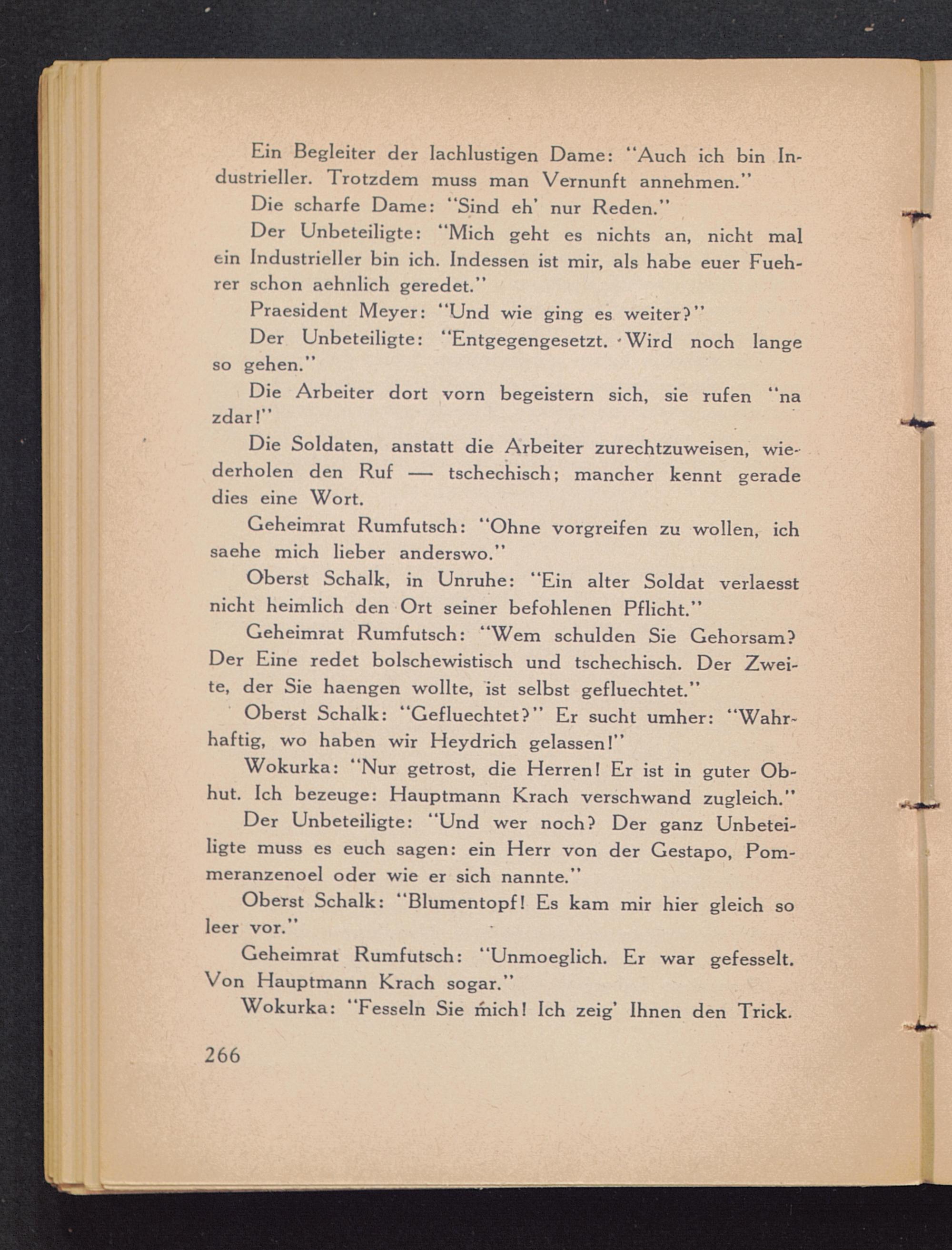 Wokurka: “Nur getrost, die Herren! Er ist in guter Ob-hut. Ich bezeuge: Hauptmann Krach verschwand zugleich."